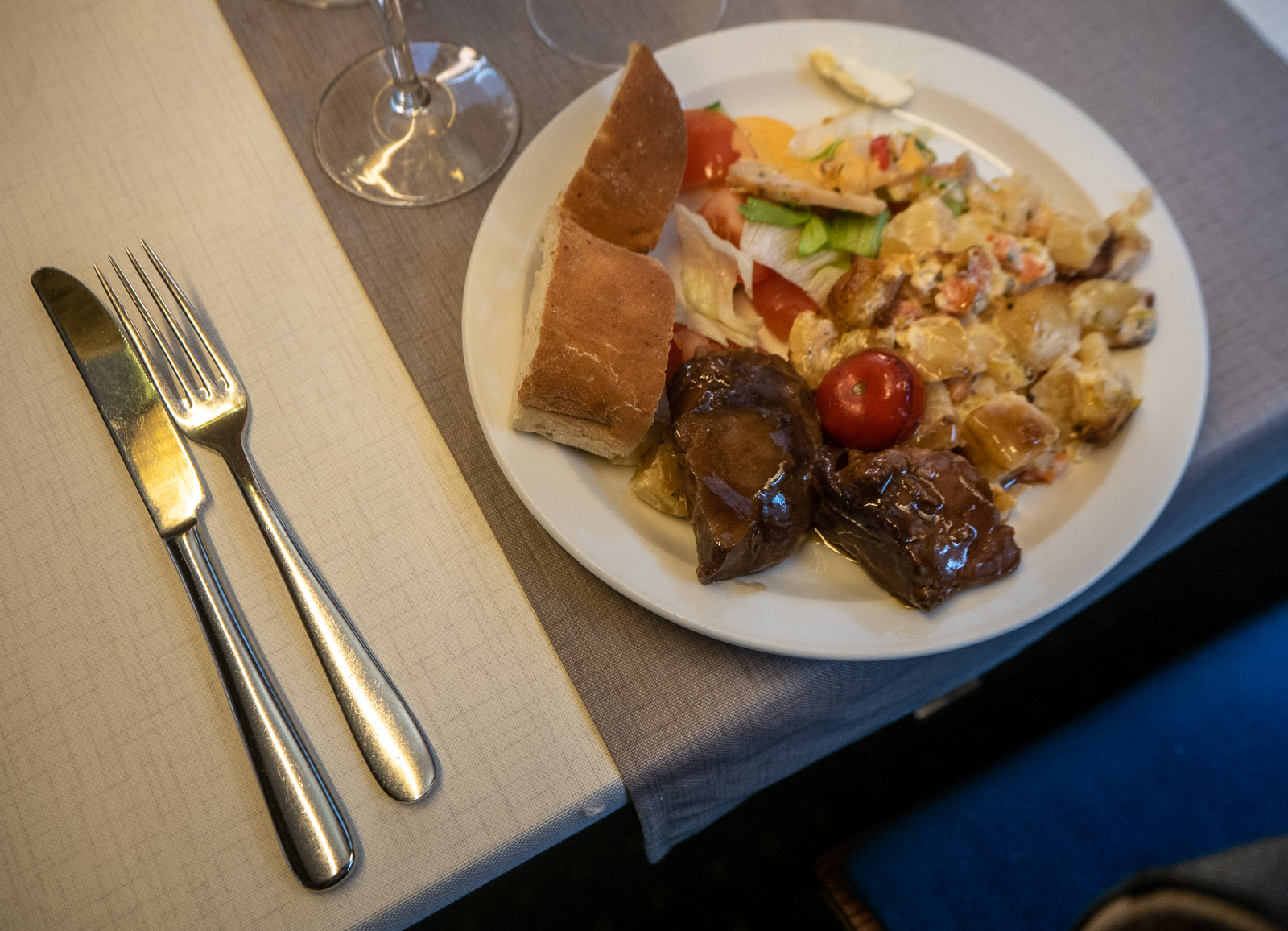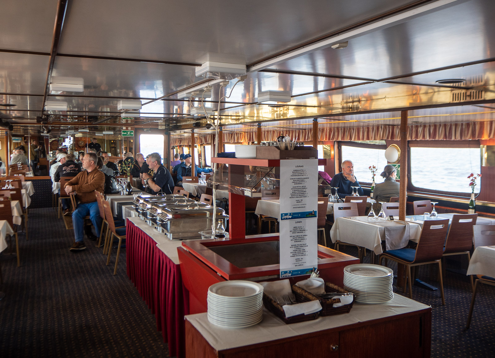 Ravintolassa on mennen tullen pari kattausta seisovasta pöydästä tai vaihtoehtona hiukan kevyempi keittolounas (tai -illallinen). Kahvilasta saa mm. suosittuja katkarapuleipiä ja vaikka hot dogeja ja tietysti vaikka sämpylöitä, viinereitä tai munkkeja. Ja niin kylmiä kuin kuumia juomia.