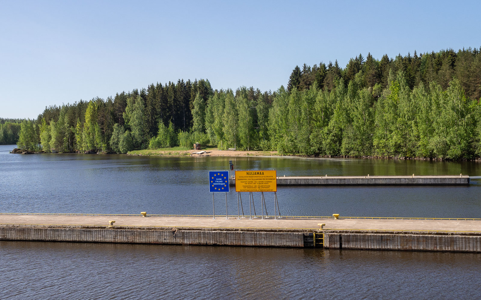 Kolmas sulku menee jo katsojaltakin rutiinilla, mutta matkan tietynlainen jännittävyys säilyy laivan lipuessa Nuijamaan järvelle. Kohta ylitämme Suomen ja Venäjän välisen rajan! Kapean kanavan sijaan laiva kulkee hetken aikaa järvellä. Mainio risteilyemäntä Kirsi-Maria opastaa etsimään katseellaan harmaata betonista möhkälettä, rajamerkkiä.