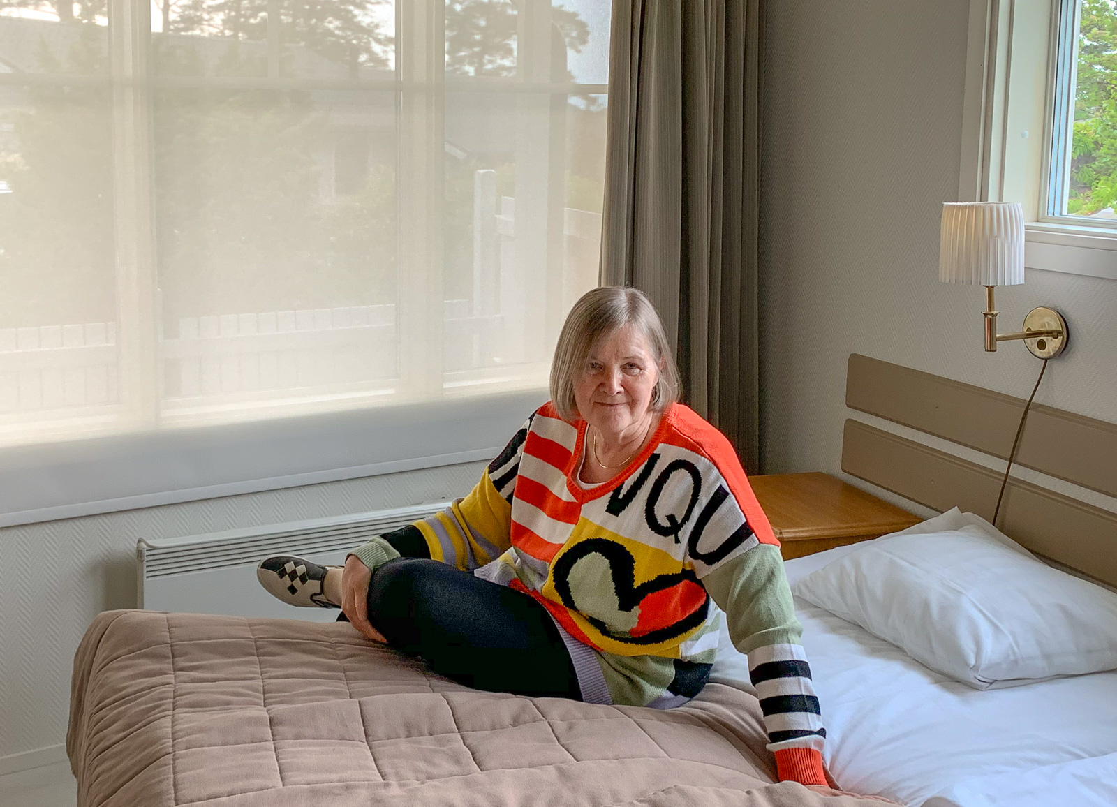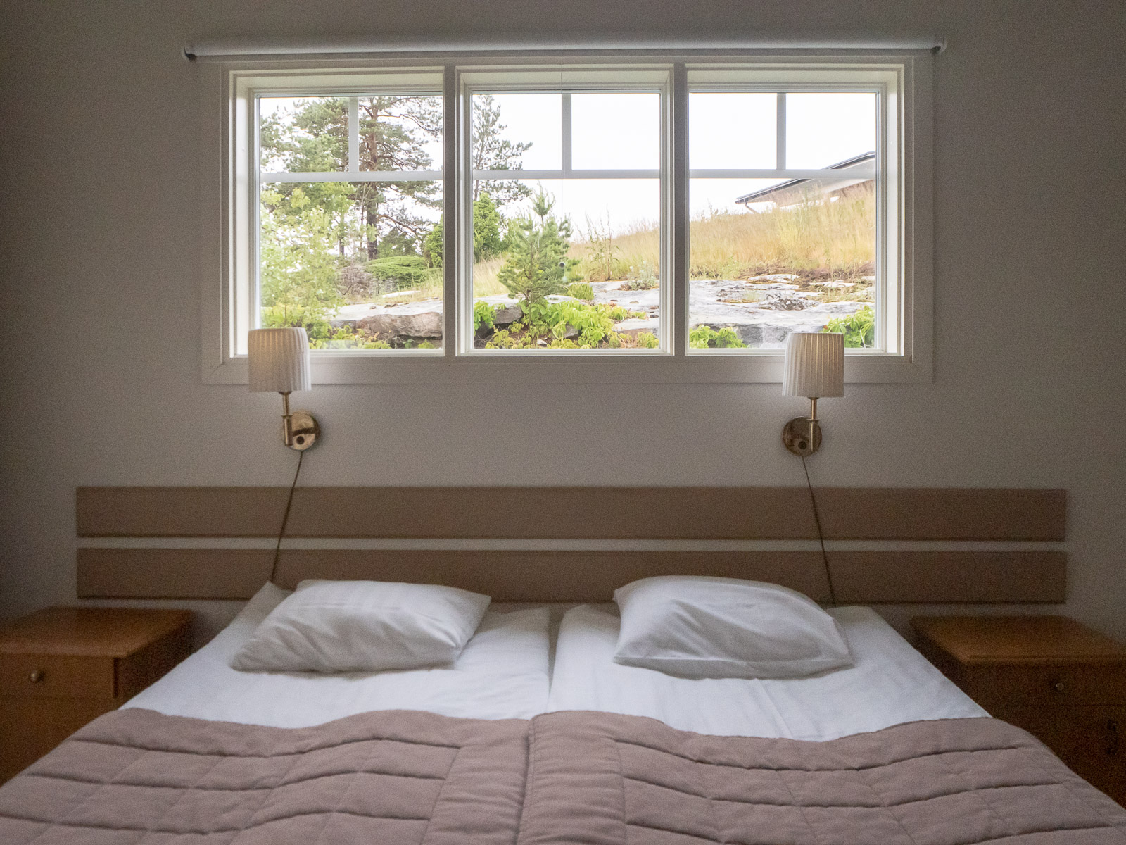 Valoisa makuuhuone voisi olla ongelma lapsiperheille tai muuten herkästi öiseen valoisuuteen suhtautuville ja rullaverhoilla huoneen luultavasti saisi halutessaan aika pimeäksikin, mutta meille kesäyön valoisuus ja ympärillä oleva saaristoluonto oli positiivinen asia.