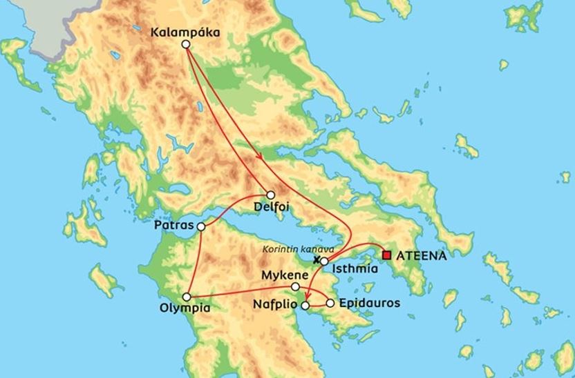 - päivä: Nafpliosta Olympiaan. Paluu Ateenaan Rion-Antirion sillan ja Melagavin majakan kautta.