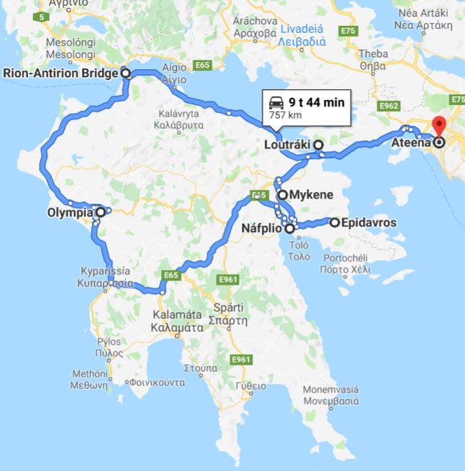 Meteorasta palattuamme olemme Ateenassa kolme päivää ja sen jälkeen lähdemme kahden päivän retkelle Peloponnesoksen niemimaalle. Peloponnesoksen osalta tutkimme niin auton vuokrausta kuin Viatorin valmiita retkiä, mutta päädyimme lopulta rakentamaan oman retken Athens Photo Tourin kanssa. Idean sain yhden valmiin retken kommenteista, jossa kehuttiin heidän opastaan ja otin sitten suoraan yhteyttä tuohon yritykseen retki-ideani kanssa ja pyysin tarjousta. Muutaman mailikierroksen jälkeen päädyimme tällaiseen kahden päivän reittiin: