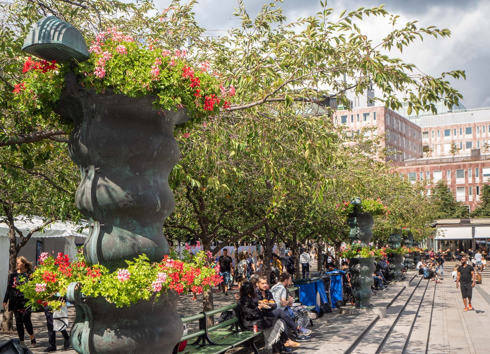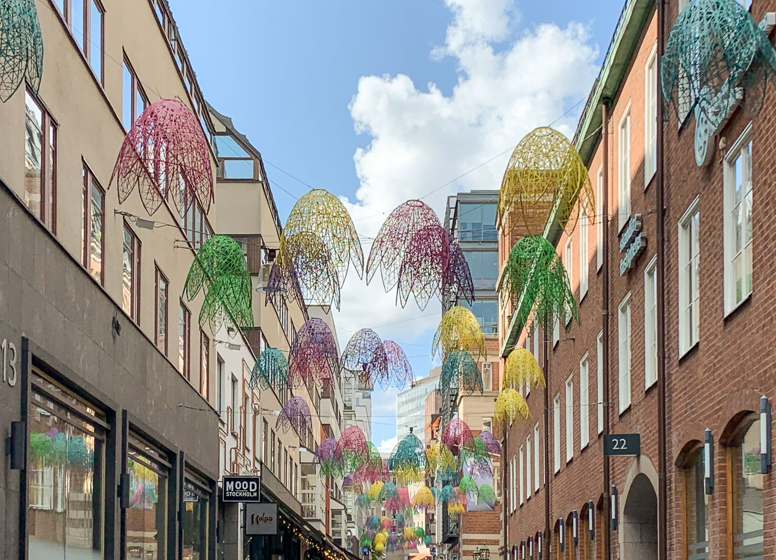 Tukholman siltojen alta jatkoimme toisena päivänä Kungsträdgårdenin kautta Biblioteksgatanille ja edelleen Jakobsbergsgatanille. Kesäinen Kungsträdgården oli kukkia tulvillaan ja Biblioteksgatanin merkkikaupat entisellään. Jakobsbergsgatanin kesäinen somistus ilahdutti kulkijaa ja toi mieleen vaikka Belgradin tai Port Louisin Mauritiuksella sateenvarjoineen, vaikka täällä sateenvarjot olivatkin vaihtuneet tyyliteltyimpiin koristeisiin.