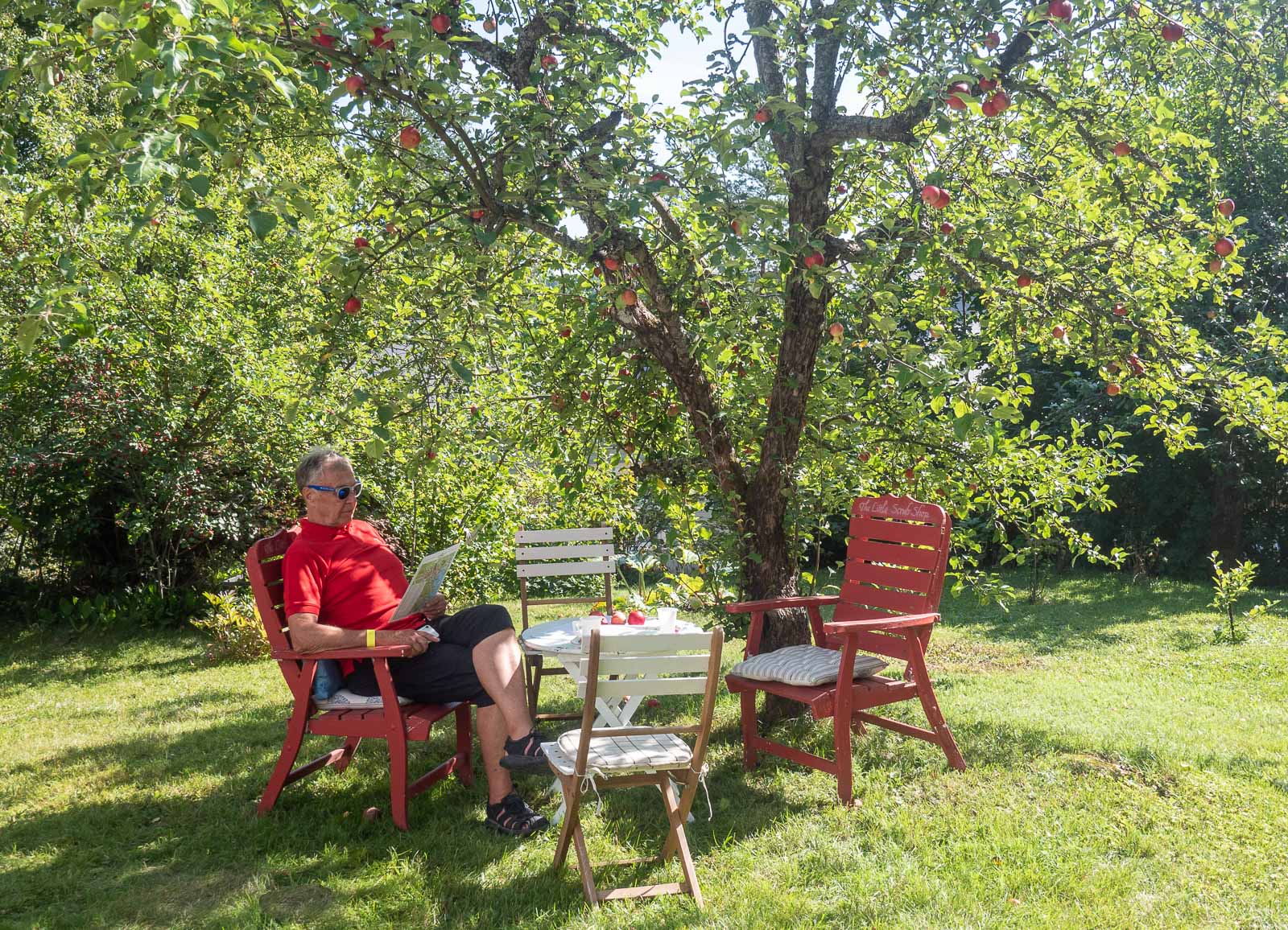 Villa Engel Itäisellä Harjutiellä vaati hiukan kiipeämistä, mutta se palkittiin välittömästä runsaalla tarjoilulla ja kauniilla puutarhalla. Puutarhan siimeksessä nautittujen sämpylöiden lisäksi matkaamme päätyi purkillinen mangochutneyta.