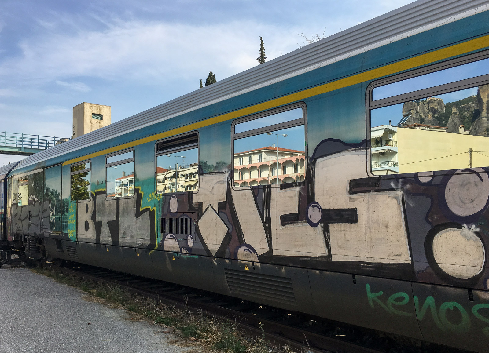 Ateenasta on matkaa Meteoraan n. 350 kilometriä – vähän pitkä matka ajettavaksi, meistä ainakin. Tarjolla on myös pitkän päivän bussiretkiä, mutta ei se, että istuu matkan turistibussissa tee siitä lyhyempää. Valitsimme lopulta junavaihtoehdon, joka osoittautuikin kaikin tavoin mukavaksi. Tai melkein kaikin tavoin: 7:20 Ateenasta lähtevä aamujuna oli kieltämättä hiukan aikainen lähtö, kun hotellimme aamiainenkin alkoi vasta 6:30.