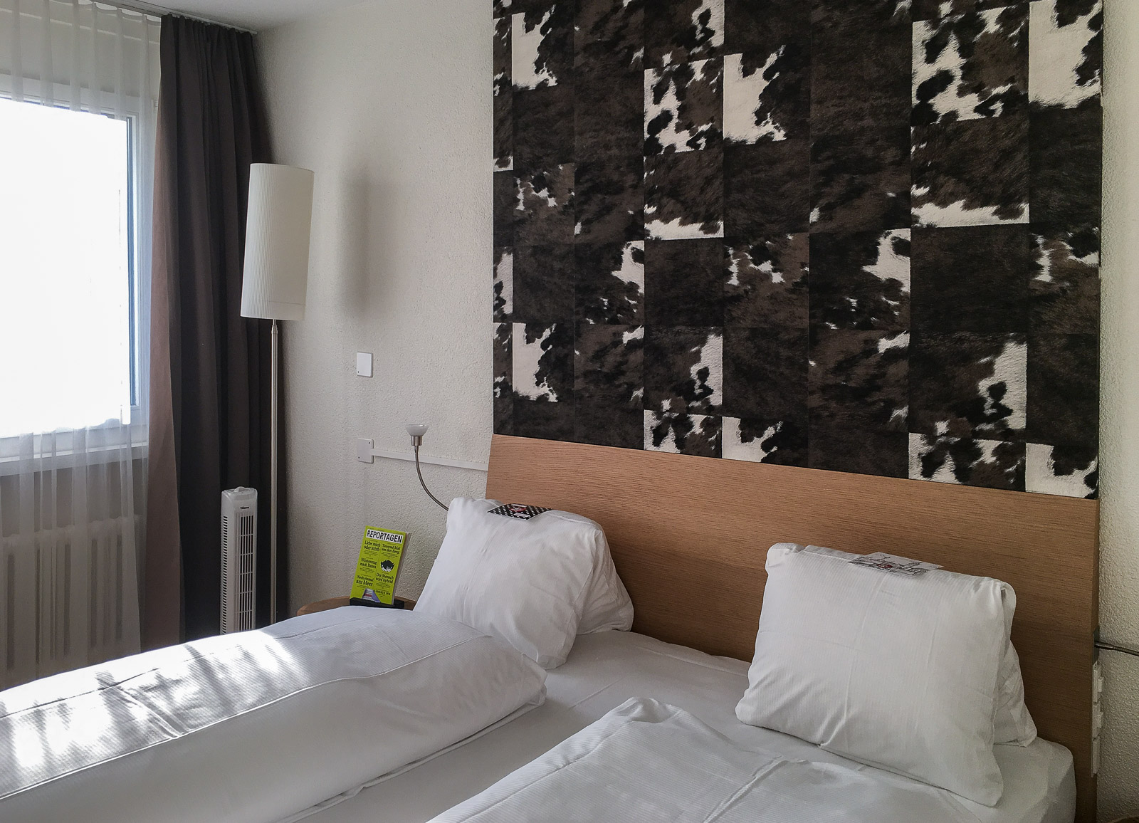 Hotelli sijaitsi muutaman raitiovaunupysäkin päässä keskustasta, mutta huoneen hintaan kuului joukkoliikennelippu koko vierailumme ajaksi ja pysäkille ole matkaa vain muutama sata metriä. Hotellin sijainti oli myös sikäli hyvä, että Rosengartenin puisto, jossa kävimme sunnuntai-iltana katsastamassa auringonlaskun, sijaitsi hyvinkin kävelyetäisyydellä siitä, samoin kuin pieni Spar-myymälä, josta sai ostettua niin juomia kuin eväitä roadtrippimme jatkoa varten.