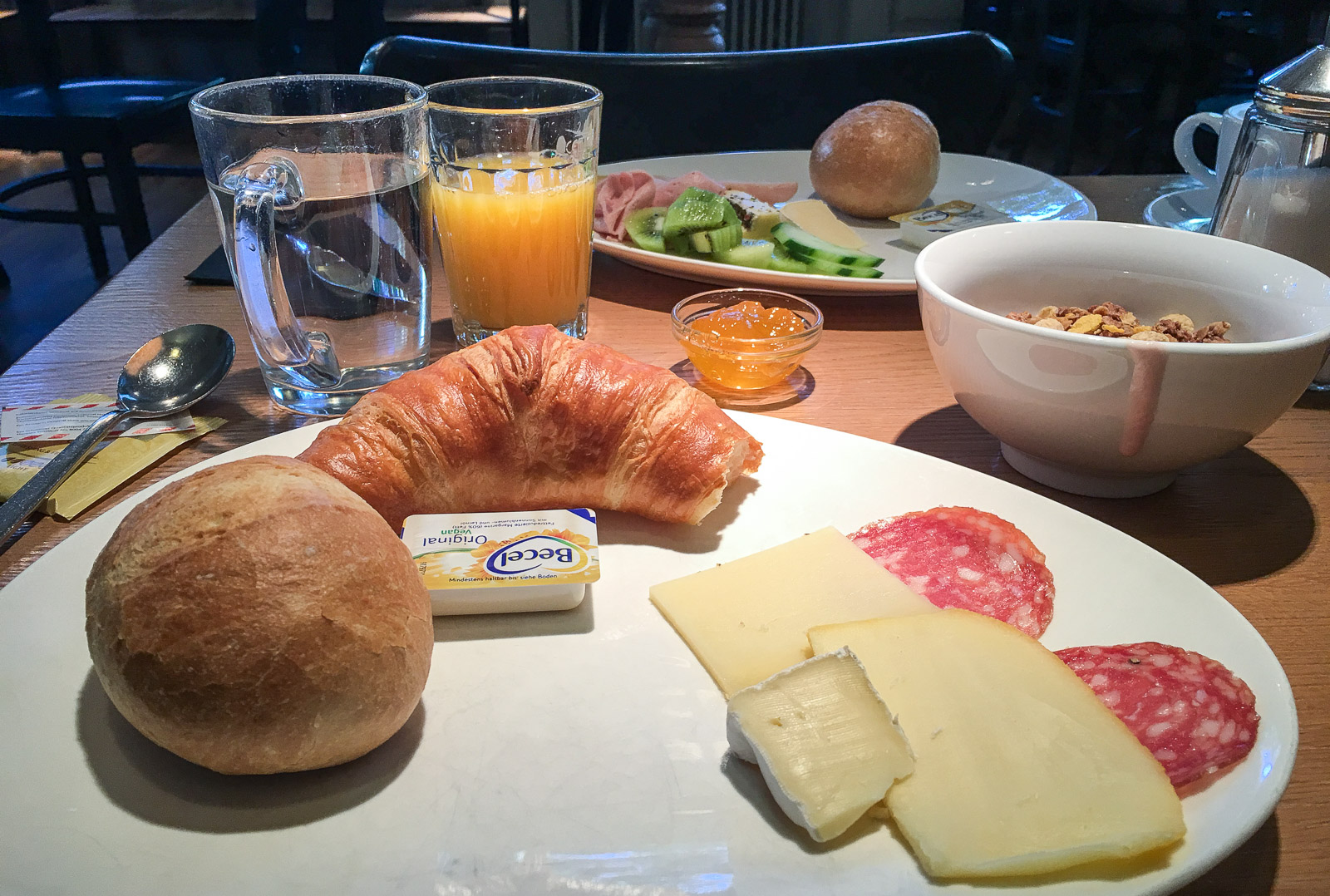 Aamiainen tarjottiin, tietysti, hotellin ravintolassa, joka ei kuitenkaan viikonloppuisin ollut muuten auki, eli emme päässeet sitä testaamaan vaan söimme Bernissä kaupungilla. Ehkä viikonloppuaukiolot ovat Sveitsissäkin ovat henkilöstökuluiltaan niin kalliita, etteivät lauantai- ja sunnuntai-illat kannata.