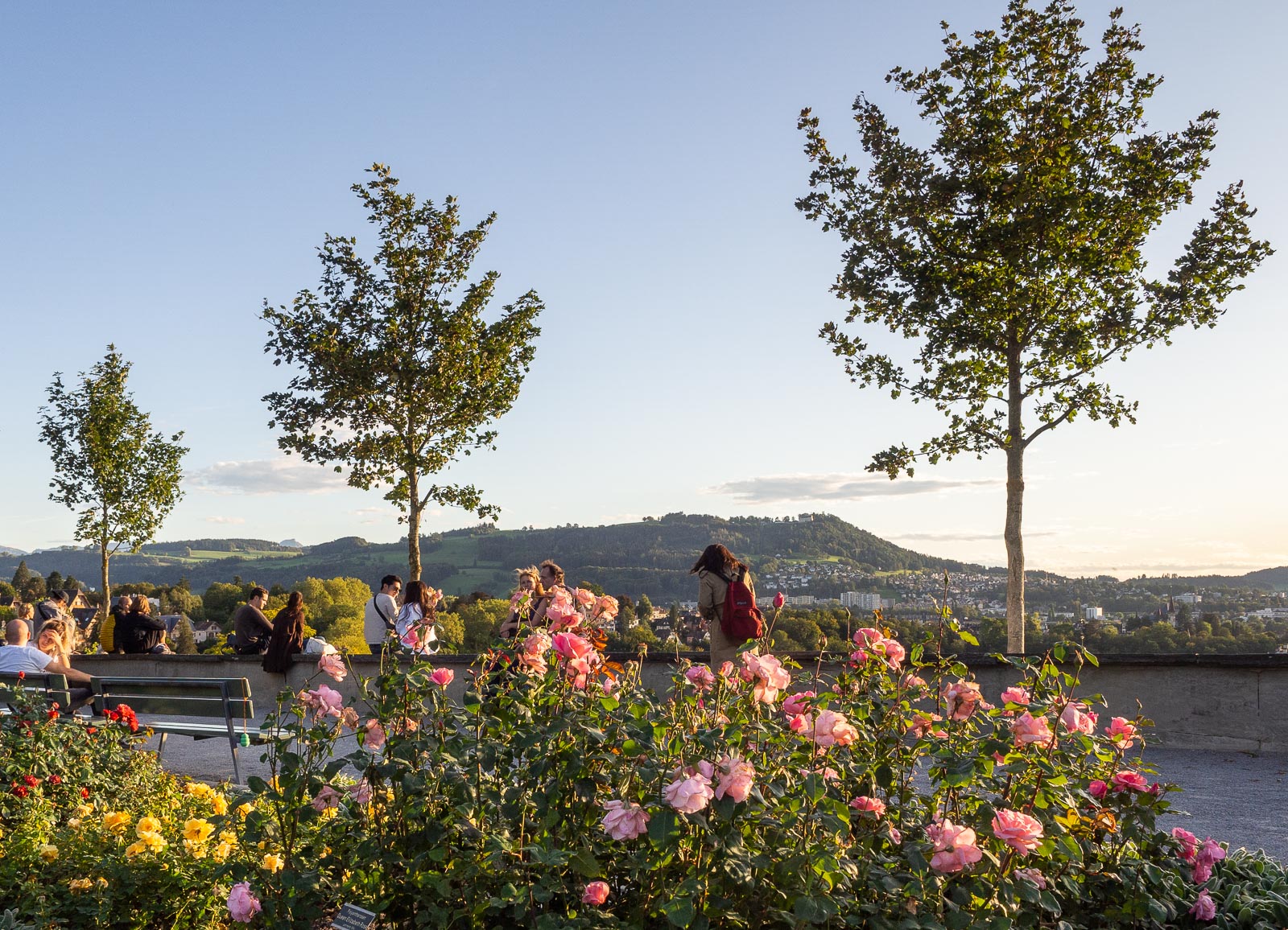 Päivän viimeinen kohteemme oli – iltapäivätauon jälkeen – Rosengartenin puisto, josta on loistavat näkymät kaupunkiin kohti laskevaa aurinkoa. Mäellä on myös pieni ravintola, mutta pääosa auringonlaskun yleisöstä seurasi tapahtumaa puiston muureilla istuen, ruohokentillä levinneiltä ehkä alunperin ravintolan terassin tuoleilta tai vaan seisten tai kävellen.