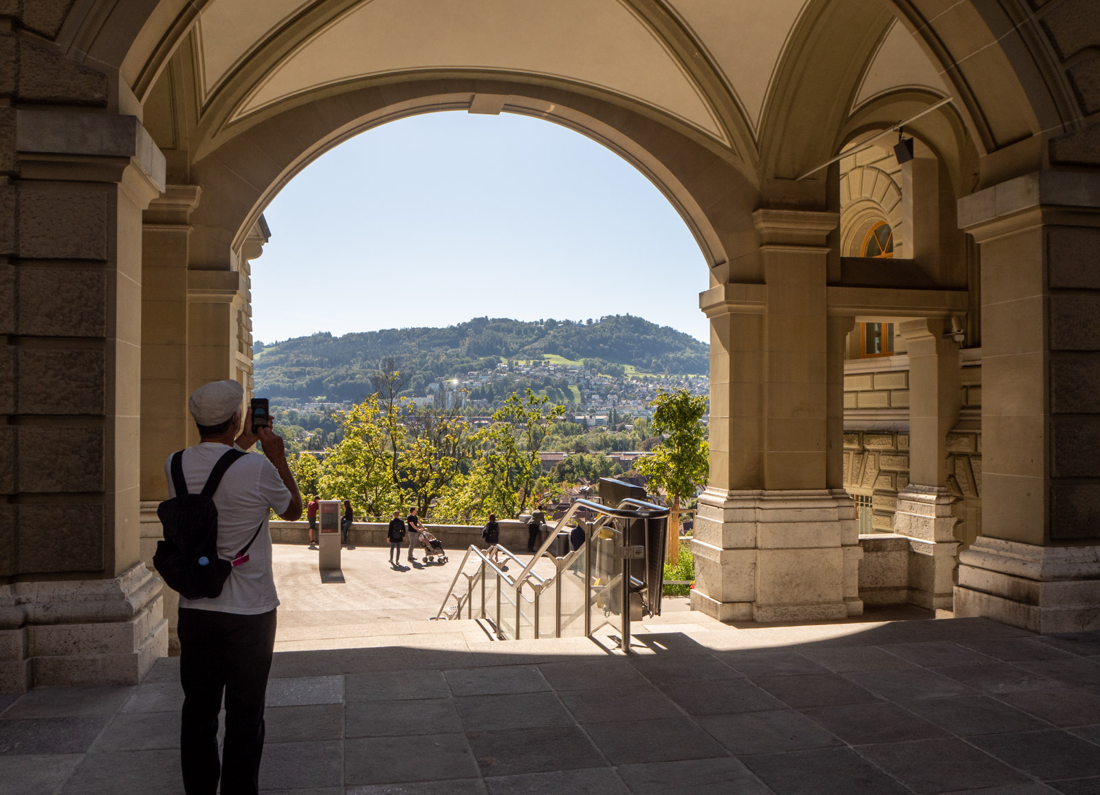 Kävelyretkemme Hauptbahnhofilta kellotornille, jonka päätimme ensimmäiseksi kohteeksemme, kulki kiemurrellen. Monet ihmiset näyttivät hakeutuvan vanhan kaupungin laidalle, terassille, josta on upeat näkymät alas kaupunkiin ja vuorille, joten kiersimme mekin sitä kautta. Kyllä kannatti!
