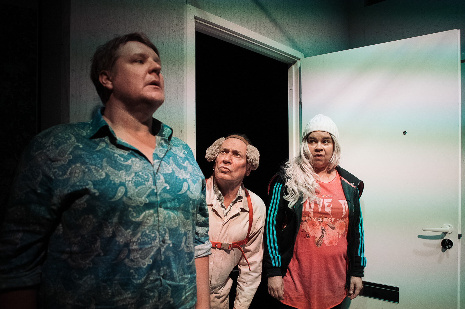 Kuvat näytelmästä ovat Onnellisten saaren lehdistömateriaalista ja ne ovat Mitro Härkösen ottamia. Amos Rexin näyttelyn kävimme katsomassa pressitilaisuudessa.