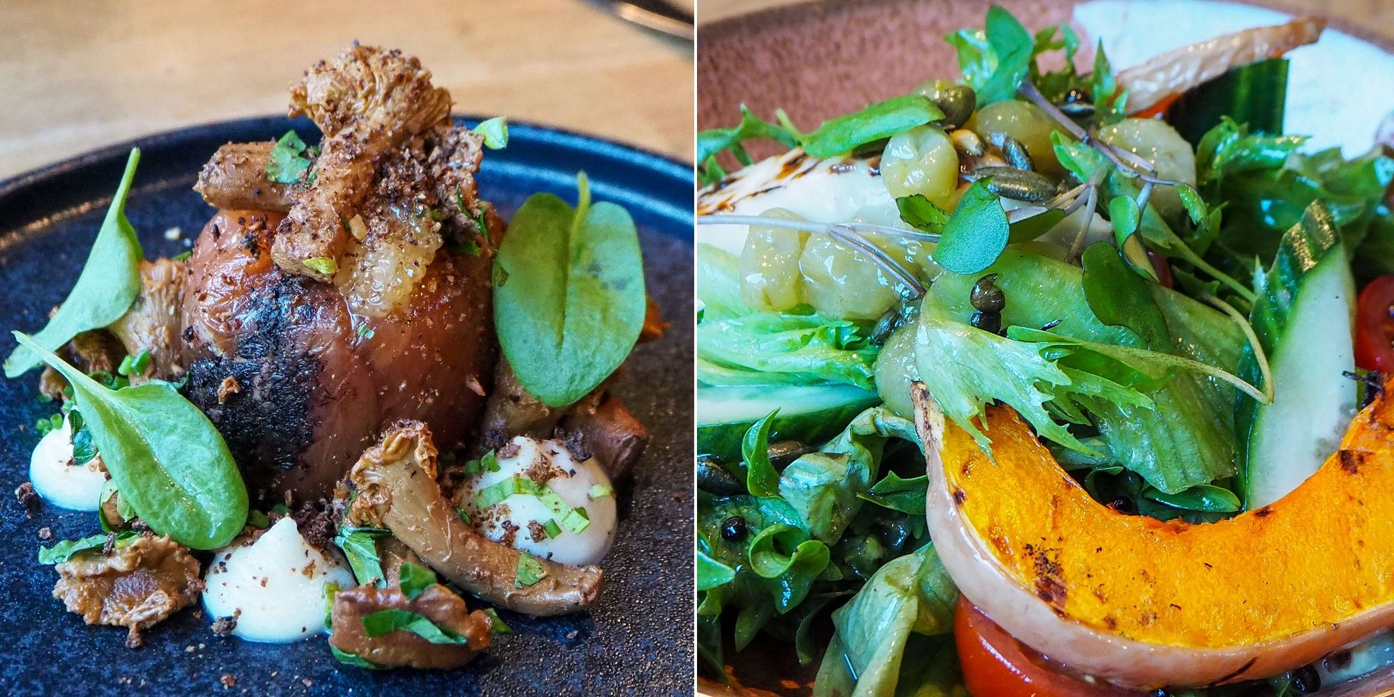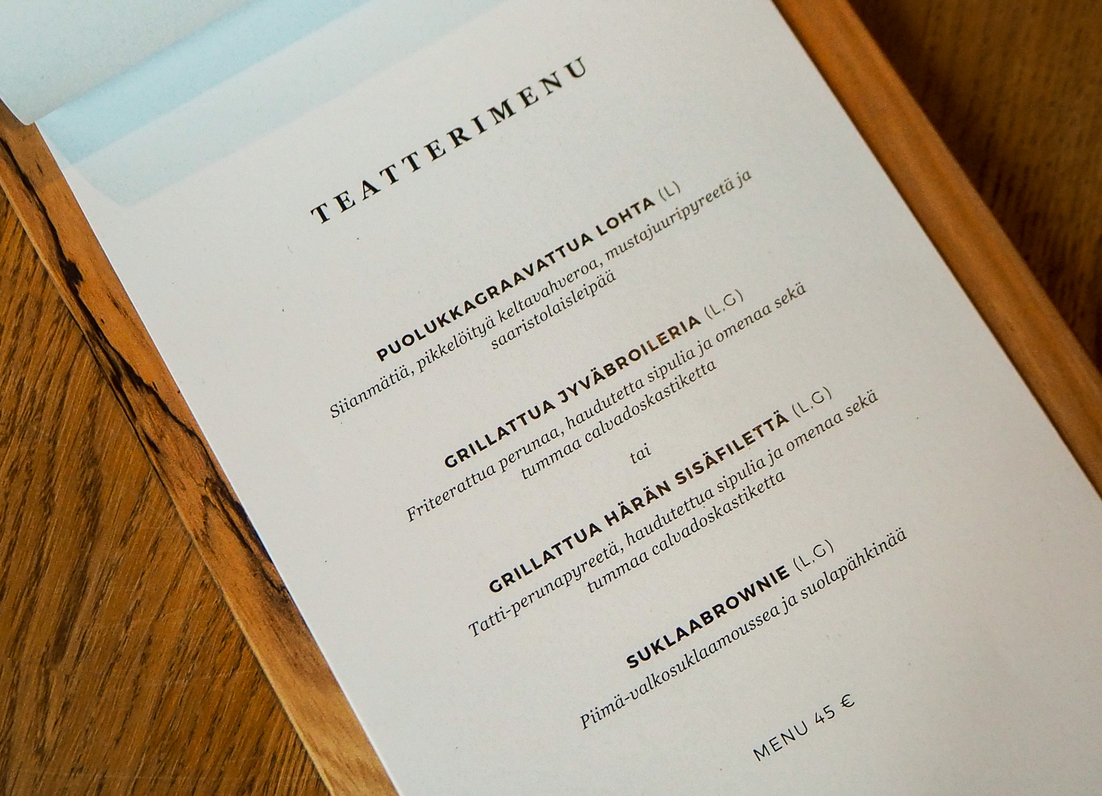 Ennen illan teatteriesitystä nautimme hotellin Gunnar Eatery & Bar -ravintolassa teatterimenun. Valmis menukokonaisuus oli varmasti mietitty teatteri-iltaan sopivaksi, mutta onnistuimme silti neuvottelemaan keittiön kanssa siihen sen verran muutoksia, että saimme kaikista kolmesta ruokalajista kummallekin eri vaihtoehdot. Puolukkagraavatun lohen rinnalla testasimme vihersalaatin, joka osoittautui kurpitsoineen ja karviaishillokkeineen yllätykselliseksi, joskin alkuruuaksi vähän liiankin isoksi. Pääruuaksi tarjotut liha- ja kana-annokset olivat juuri sopivia, samoin kauniit jälkiruuat, joista teatterimenun suklaabrownien rinnalla testasimme tyrnipossen.