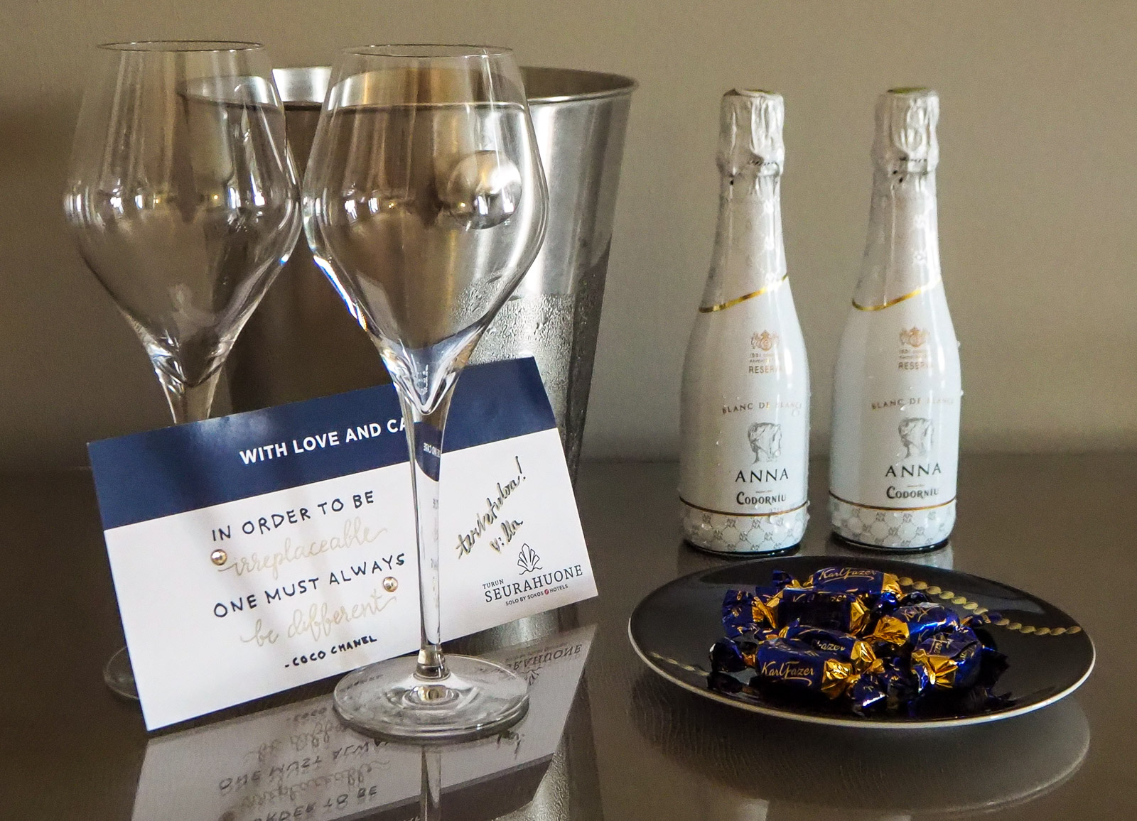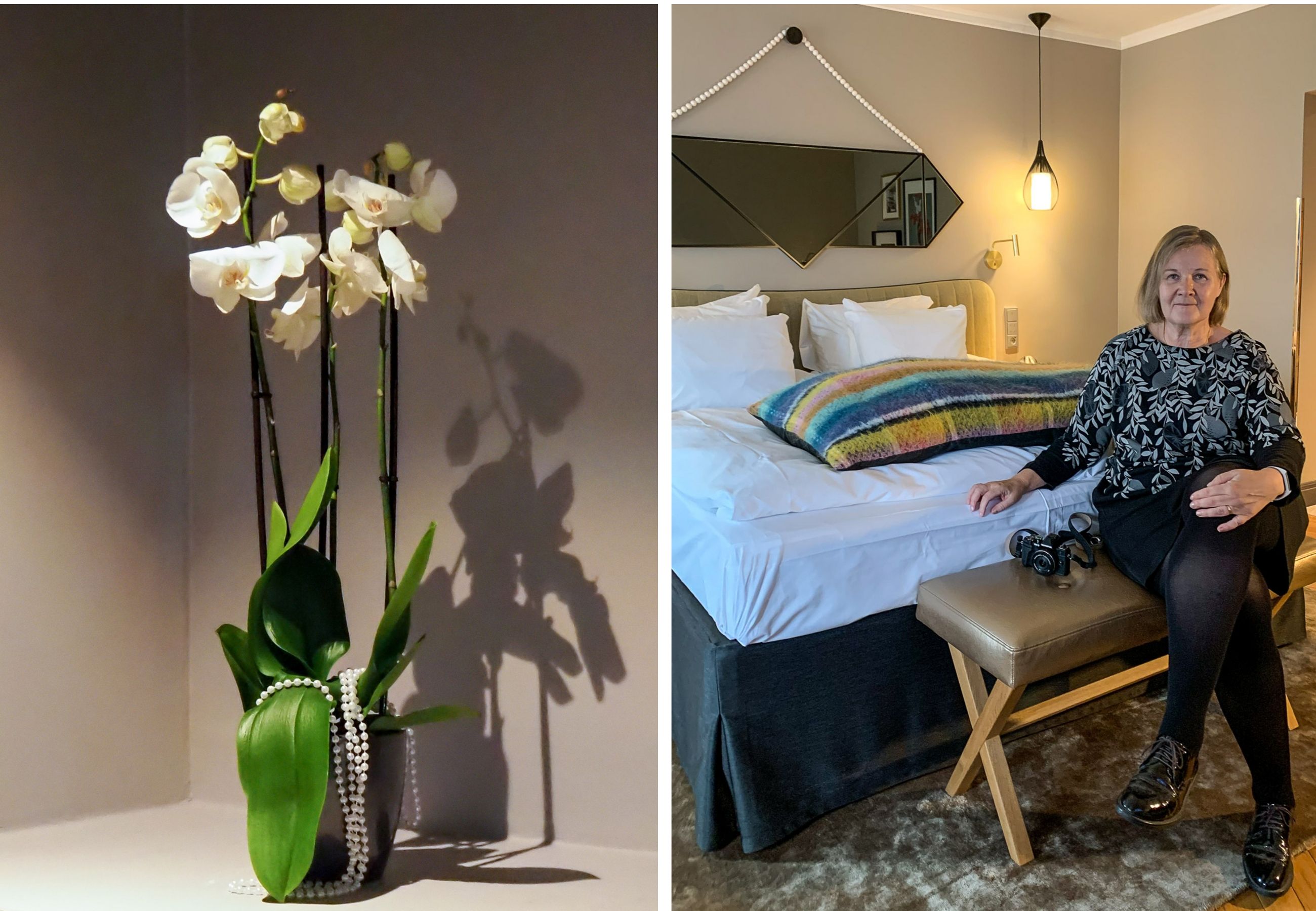 Saavuimme hotellille alkuiltapäivästä jo hiukan ennen kuin huoneemme oli valmis, mutta ei haitannut, saatoimme viivähtää hetken hotellin kodikkaassa aulassa “takkatulen” äärellä. Nauttia kupilliset kahvia/teetä ja mussuttaa vastaanottotiskin suklaakulhosta poimittuja Marianne-rakeita. Hetken ihmettelin karkkivalintaa, mutta pitempään hotellissa oltuani oivalsin, että ne ovat osa hotellin helmiteemaa, jonka sen jälkeen löysinkin kaikkialta. Kiva yksityiskohta, joka sitoo asioita yhteen, kuitenkin osoittelematta.