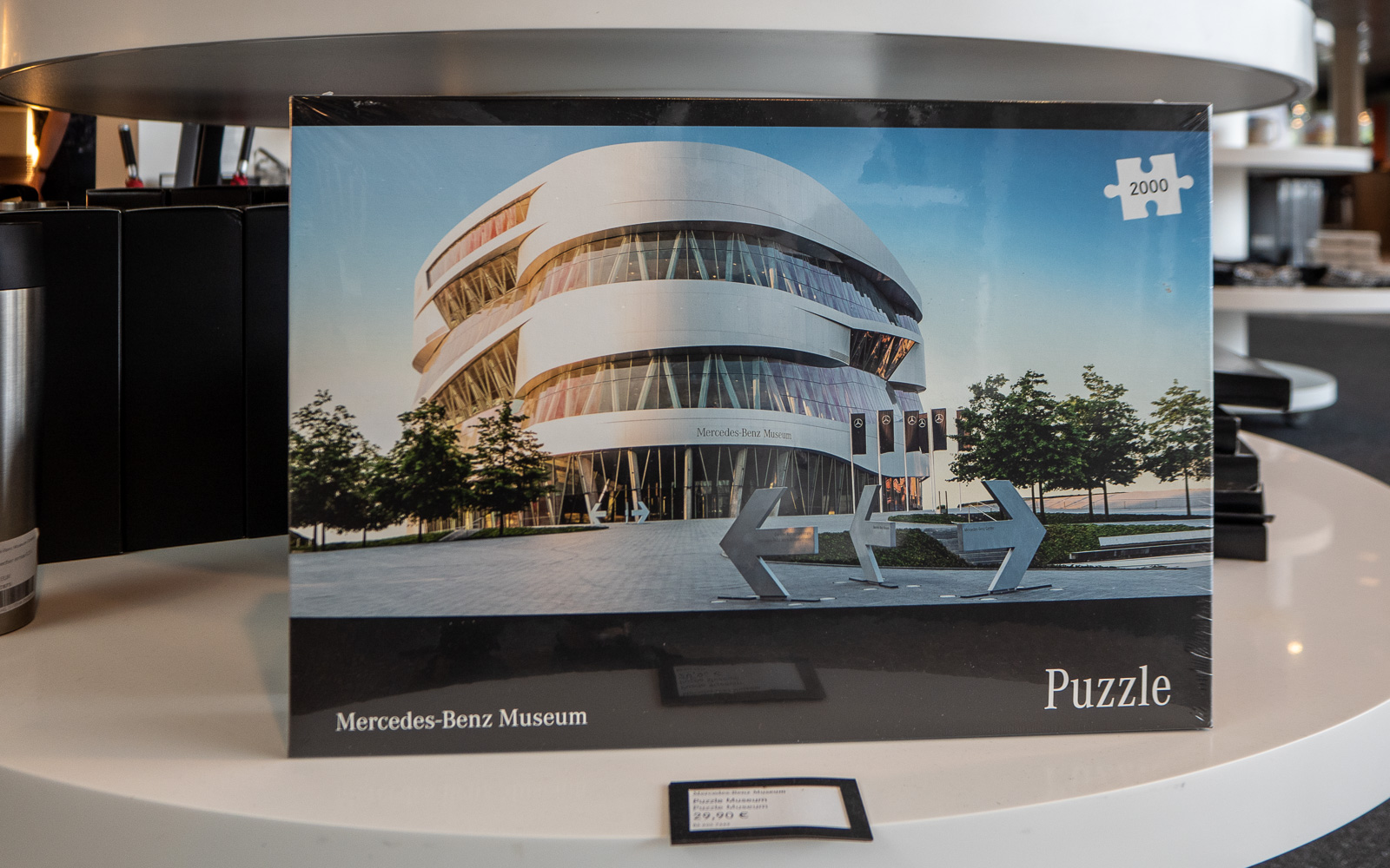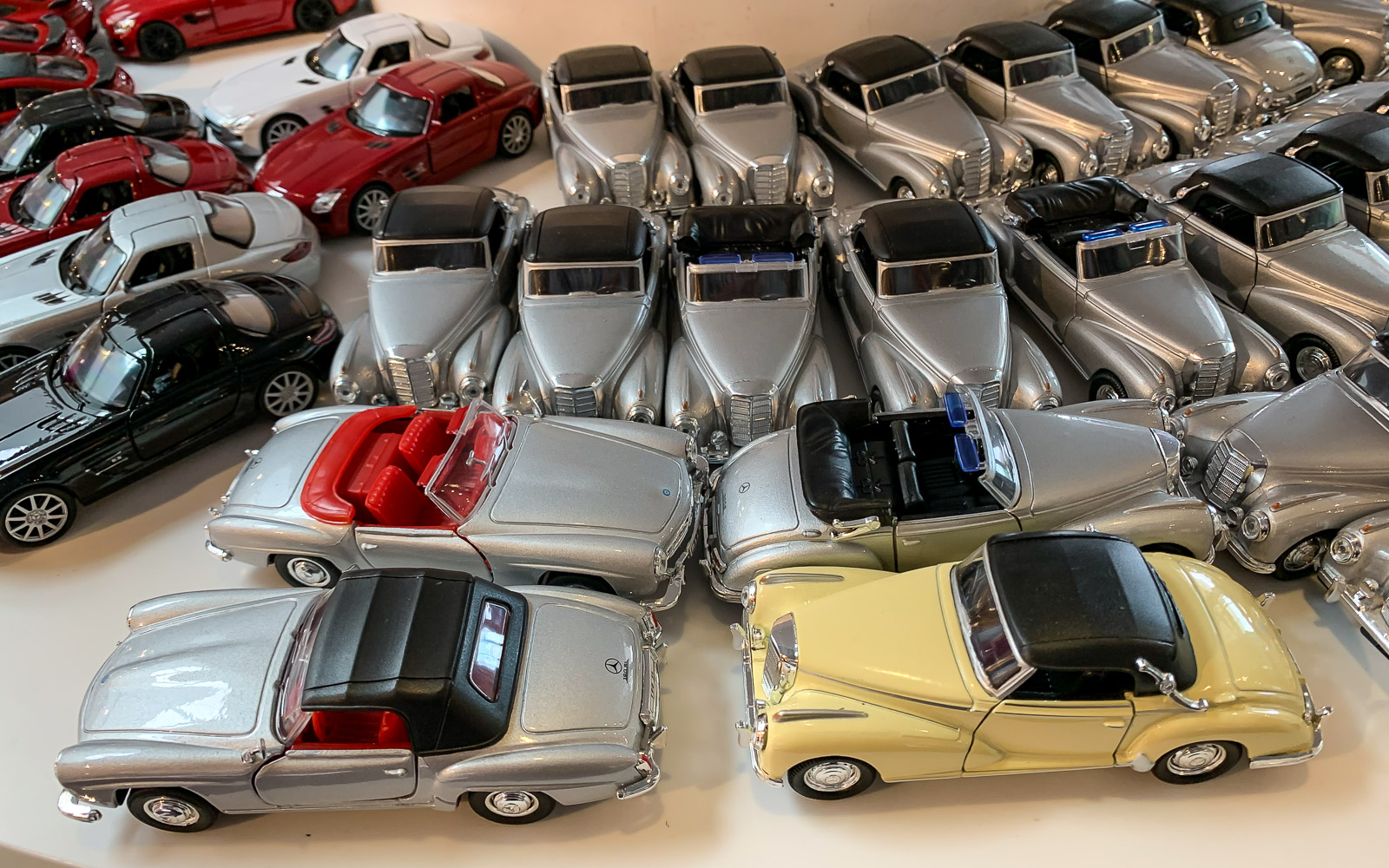 Kunnon museovierailun tapaan jäljellä on vielä vierailu museokaupassa ja museokahvilassa, jotka molemmat sijaitsevat talon pohjakerroksessa. Museokauppa on kokoluokaltaan ihan jotain muuta kuin tyypilliset taidemuseoiden museokaupat: täällä on kaikkea, vaatteista ja asusteista astioihin ja leluihin – vain oikeat, täysikokoiset, autot puuttuvat. Huomaan hypisteleväni pikkuautoa ja miettiväni, että aukeavatko tämän ovet. Minulla oli tällainen lapsena, en tosin tiedä, oliko se mersu, mutta saattoi ollakin! Jätämme kuitenkin pikkuautotkin kauppaan ja suuntaamme kahvilaan. Oikeastaan olisimme voineet suunnata ravintolaankin ja syödä täällä varhaisen illallisen, mutta paikka oli varattu isolle yksityistilaisuudelle. Vaikuttikin siltä, että tässä museossa käydään paljon isoina ryhminä, niin kotimaasta kuin vaikka Aasiasta. No, selvisimme me kahvilan antimillakin reissumme “seuraavalla pysäkille”.