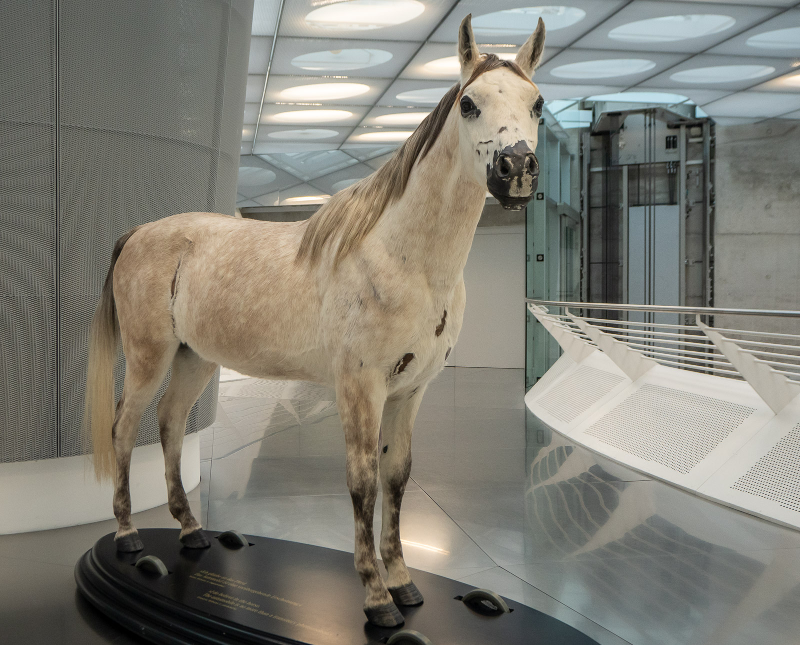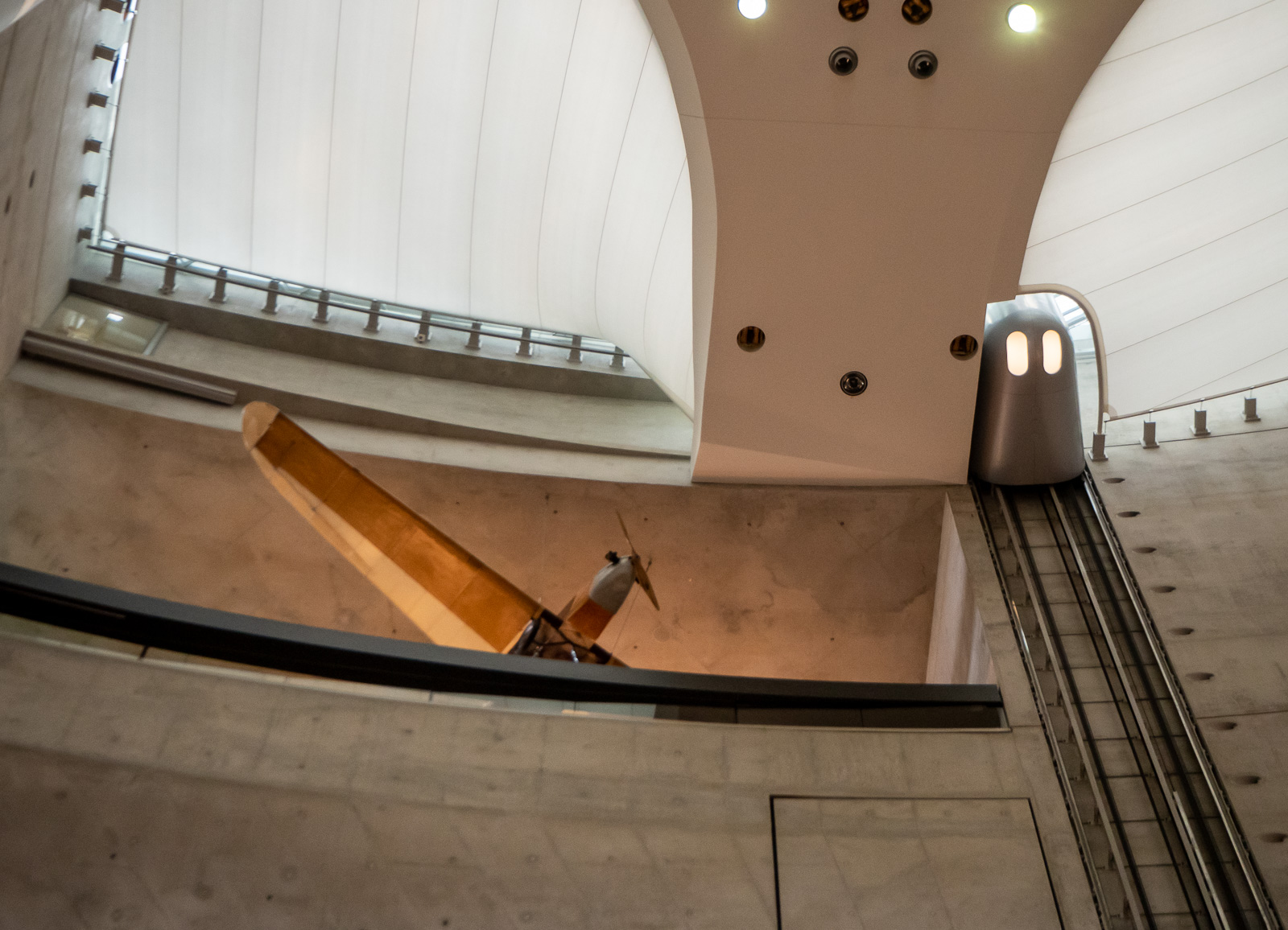 Ovelan näköinen museorakennus ei paljasta sisältöään vielä ala-aulassa. Korkealla avoimen reunalta pilkistää vanha lentokone ja tyhjän aulan reunoilla kulkevat futuristisen näköiset hissit. Aulan perällä näkyy sentään muutama autokin, joten aloitamme tutustumiskierroksemme ympyränmuotoisen alimman kerroksen reunoille sijoitetuista autoista. Ihan näyttävää joo, mutta odotimme ehkä sittenkin enemmän ja palaamme aulaan ihmettelemään, että missä se oikea museo on?