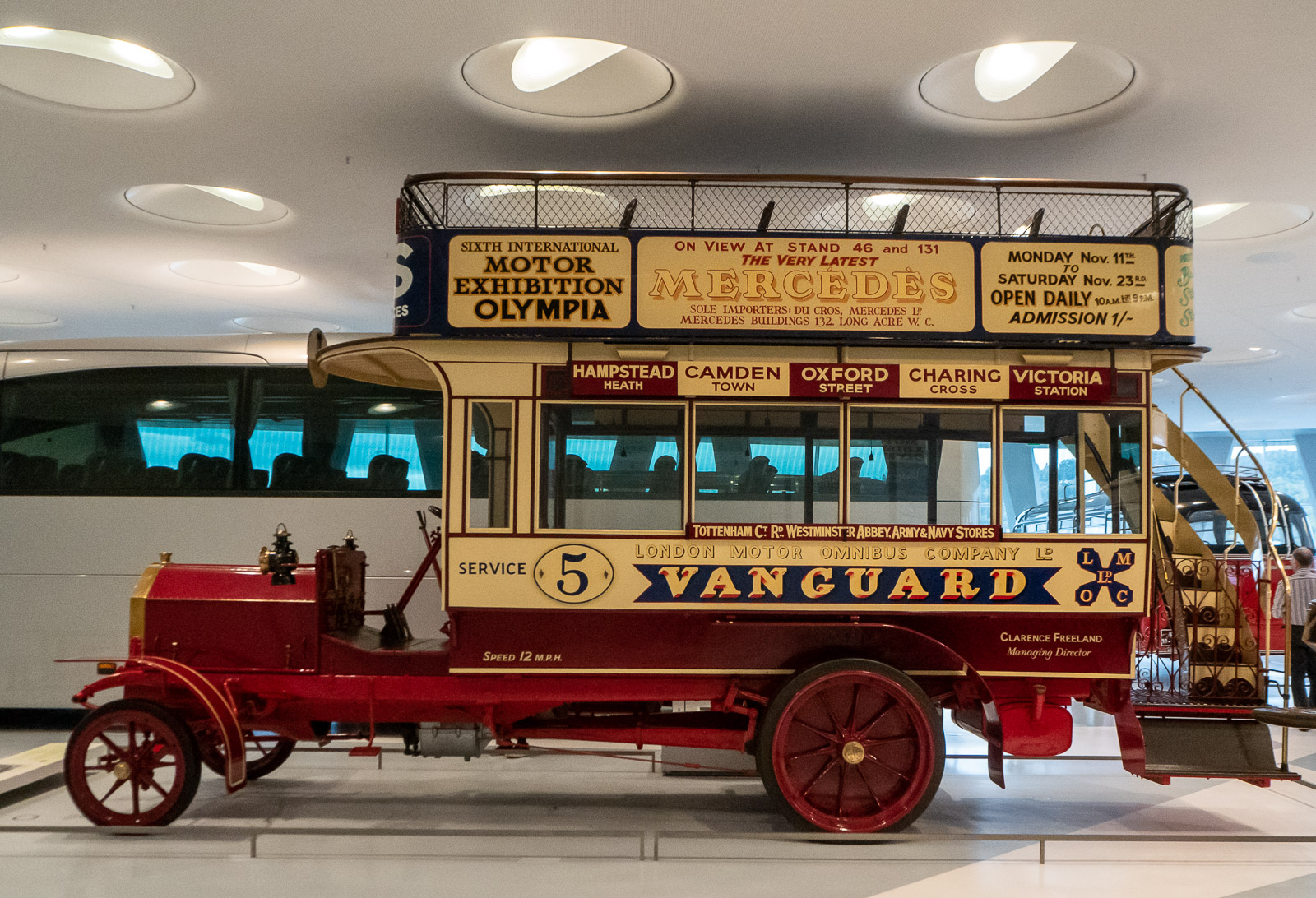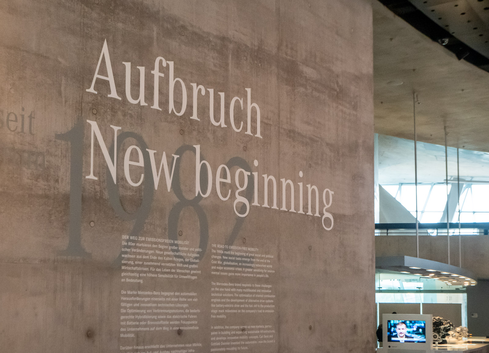 Ylimmässä kerroksessa on esillä vanhempia kulkuneuvoja, aina hevosesta alkaen ja siirryttäessä alaspäin vuosisadat ja vuosikymmenet seuraavat toisiaan. Rakennuksen seinillä kerrotaan myös ympäröivän maailman kulloisista tapahtumista, mikä auttaa sijoittamaan kulloisetkin autot sen hetkiseen maailmaan. Esimerkiksi toisen maailmansodan jälkeen iso osa tuotantokapasiteetista oli menetetty ja ensimmäisinä vuosina sallittiin vaan hyötyajoneuvojen tuotanto.