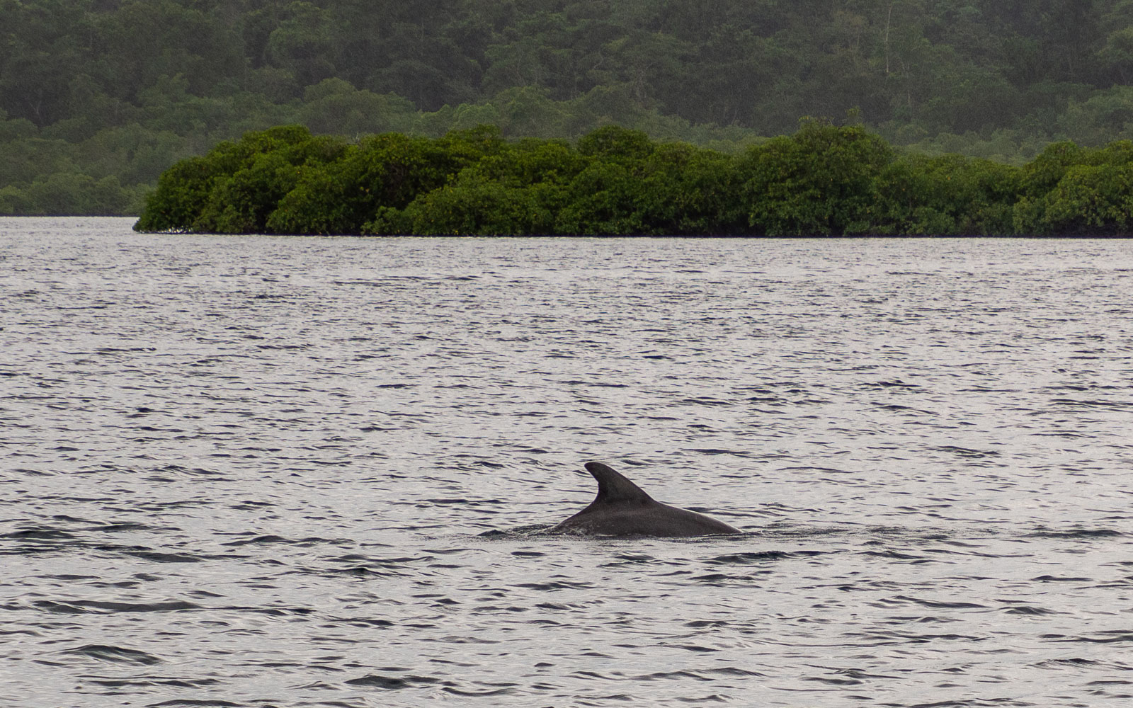 Samainen retkemme teki myös kierroksen delfiinien lahdelle (Dolphin Bay Preserve), jossa onnistuimme näkemään muutamia delfiinejä. Tätä kirjoittaessani joitakin faktoja tarkistaakseni etsin lisätietoa delfiineistä Bocas del Torossa luin myös muutamia juttuja, joissa todetaan retkiveneiden tällä alueella usein myös häiritsevän delfiinejä, mutta ainakin vene, jolla me teimme matkaa, pysytteli melko kaukana delfiineistä eikä aamulla lahdella ollut juurikaan muita veneitä. Ehkä tilanne tällä saralla on parantunut viime vuosina kuin asiasta on alettu keskustella?