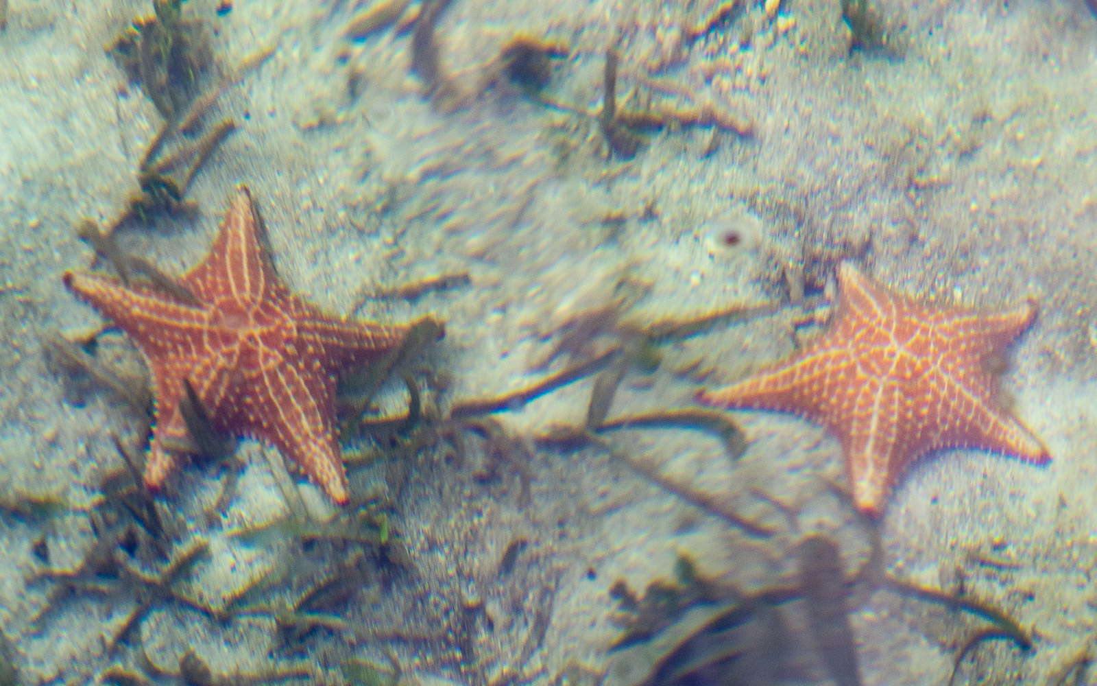 Viimeinen retkipäivän eläinkohde oli meritähtiranta (Starfish Beach). Myös päivän viimeisenä kohteena innostus ja jaksaminen oli ehkä jo vähän vähissä, joten se, että meritähtiä katsottiin vaan veneestä käsin ei haitannut. Kovin hienoja kuvia en niistä pinnan läpi osannut ottaa, mutta vielä vähemmän kuvia olisi tullut uimalla tai snorklaamalla, kun mukana ei ollut vedenalaiseen kuvaamiseen sopivaa kameraa. Adalmina’s Adventures -blogia kirjoittava Anna-Katri osallistui omalla matkallaan Bocas del Torossa ilmeisesti jokseenkin samanlaiselle retkelle kuin me ja hän taisi onnistua myös meritähtien kuvaamisessa hiukan paremmin,