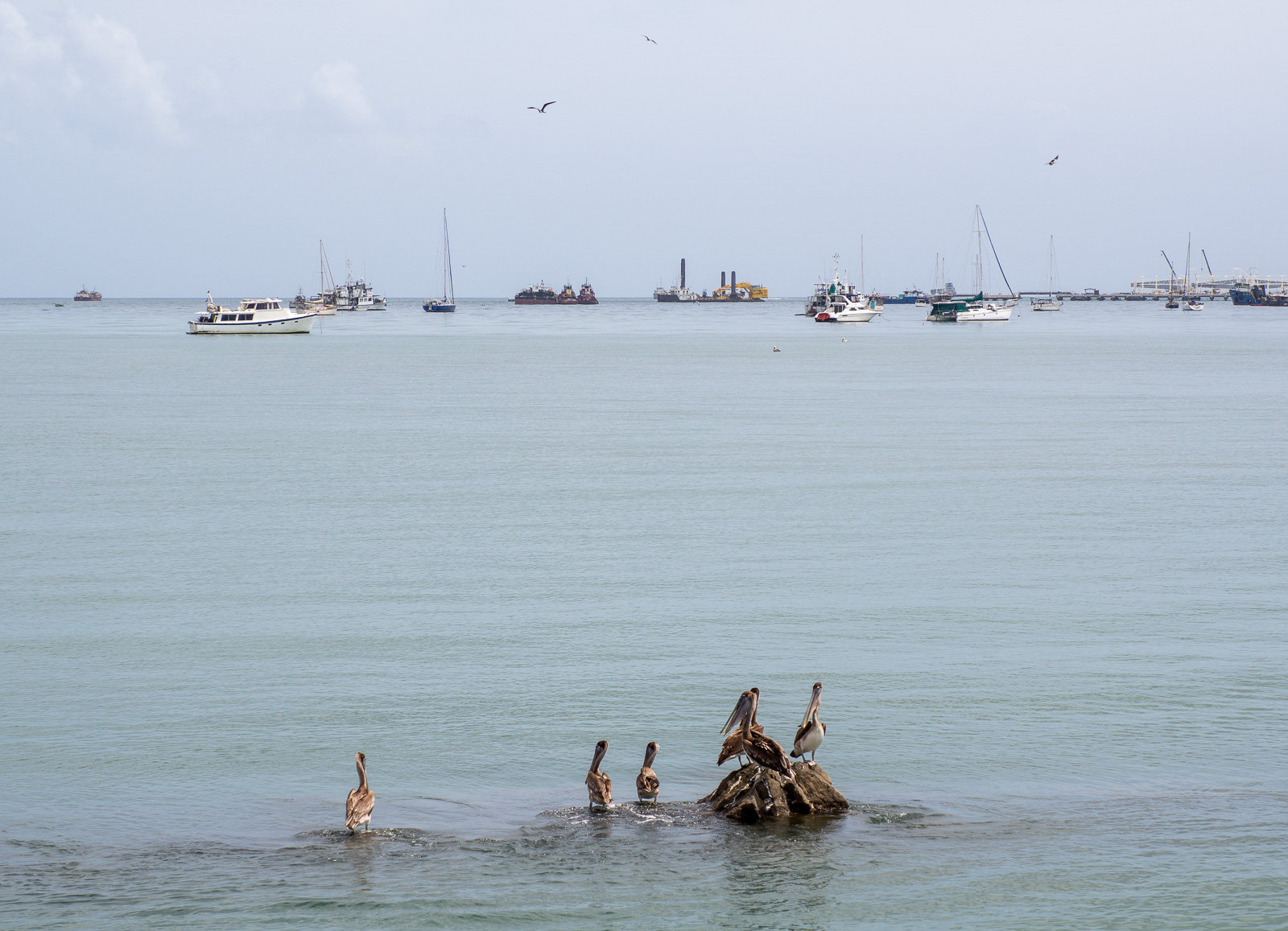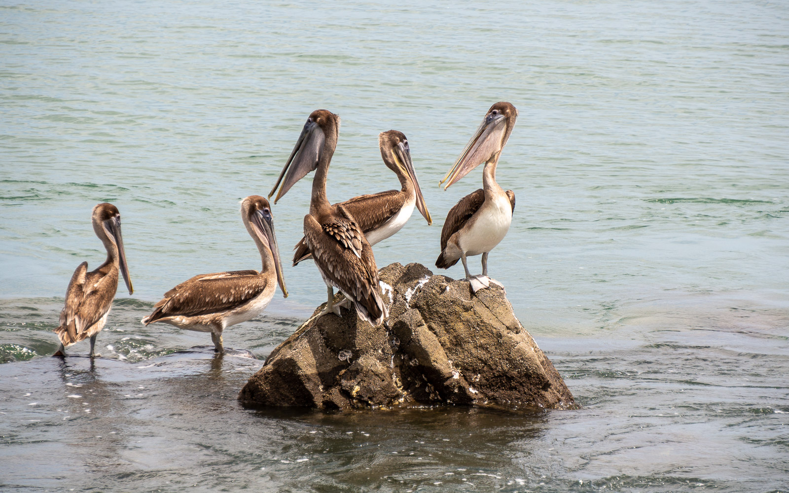 Amador Causeway, kaupungin ja muutaman pienen saaren yhdistävä pengertie, on yksi Panama Cityn nähtävyyksistä. Kävimme ajelemassa sitä jo ensimmäisellä vierailullamme kaupungissa yli kymmenen vuotta sitten ja toistamiseen, tietysti, tälläkin kertaa. Tie oli leventynyt sitten viime näkymän, sillä osa maa-aineksesta uuden kanavan rakentamisen jäljiltä on käytetty tiehen. Palaan Panama Cityyn vielä myöhemmin, mutta pelikaanit ovat tietysti osa Panamankin eläimistöä, joten siis, pelikaaneja, joita pengertien laidalla oli paljon.