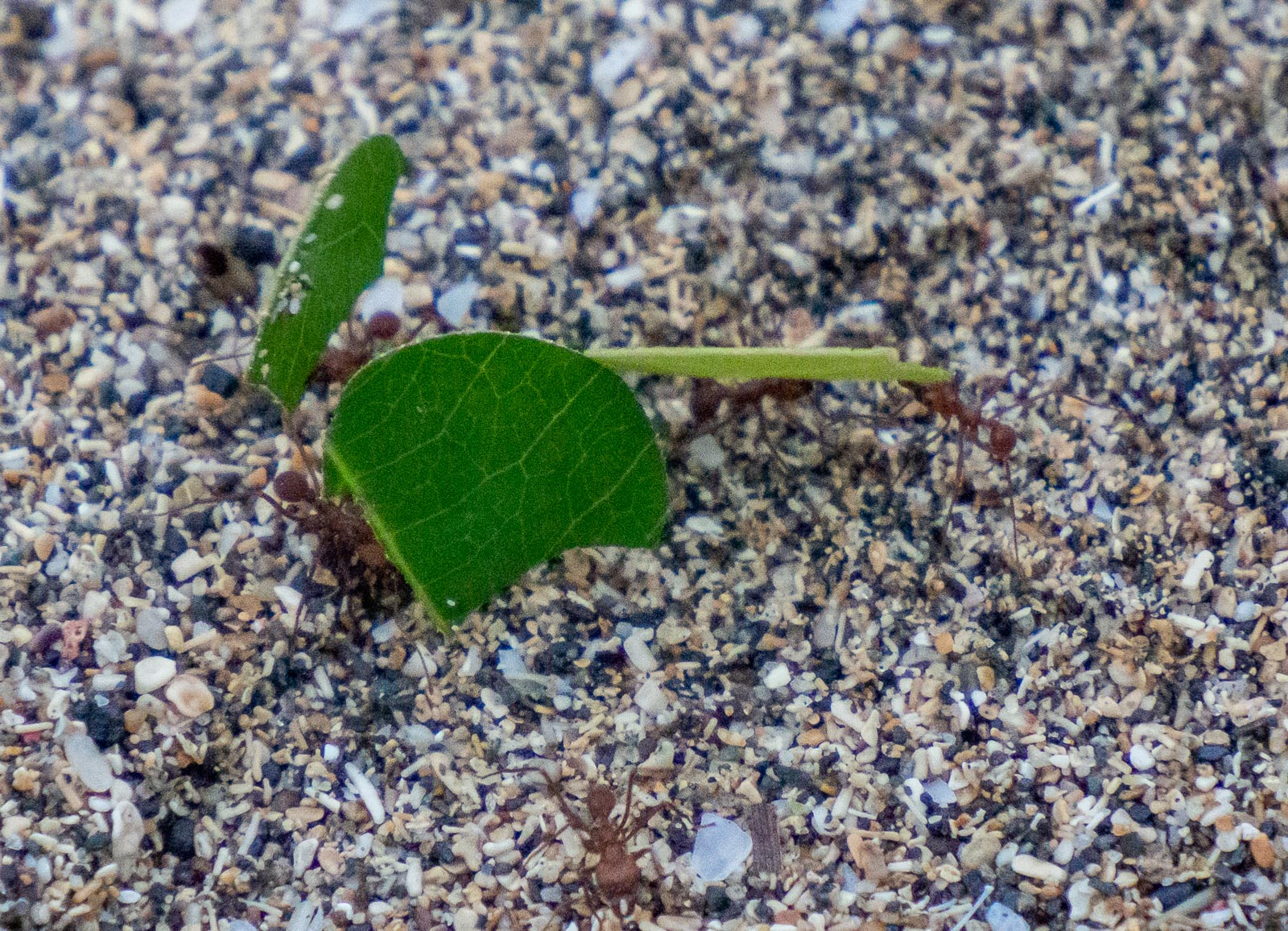 Playa Cocles, jonka rannalla resorttimme sijaitsi, tunnetaan surffirantana ja vaikka emme surffausta harrastakaan eikä surffirannoilla yleensä kovin helposti voi uida, niin suuntasimme kuitenkin hetimmiten rannalle paikallista elämänmenoa ihmettelemään. Surffareiden ja surffilautoja vuokraavien kojujen lisäksi tätä elämänmenoa tarjosivat lehdenleikkaajamuurahaiset – ensimmäiset näkemäni sitten Belizen sademetsien (2013). Näimme niitä vielä lisää Arenalissa, mutta jo näiden ensimmäisten touhuja Puerto Viejon rannalla seurasin innokkaasti.