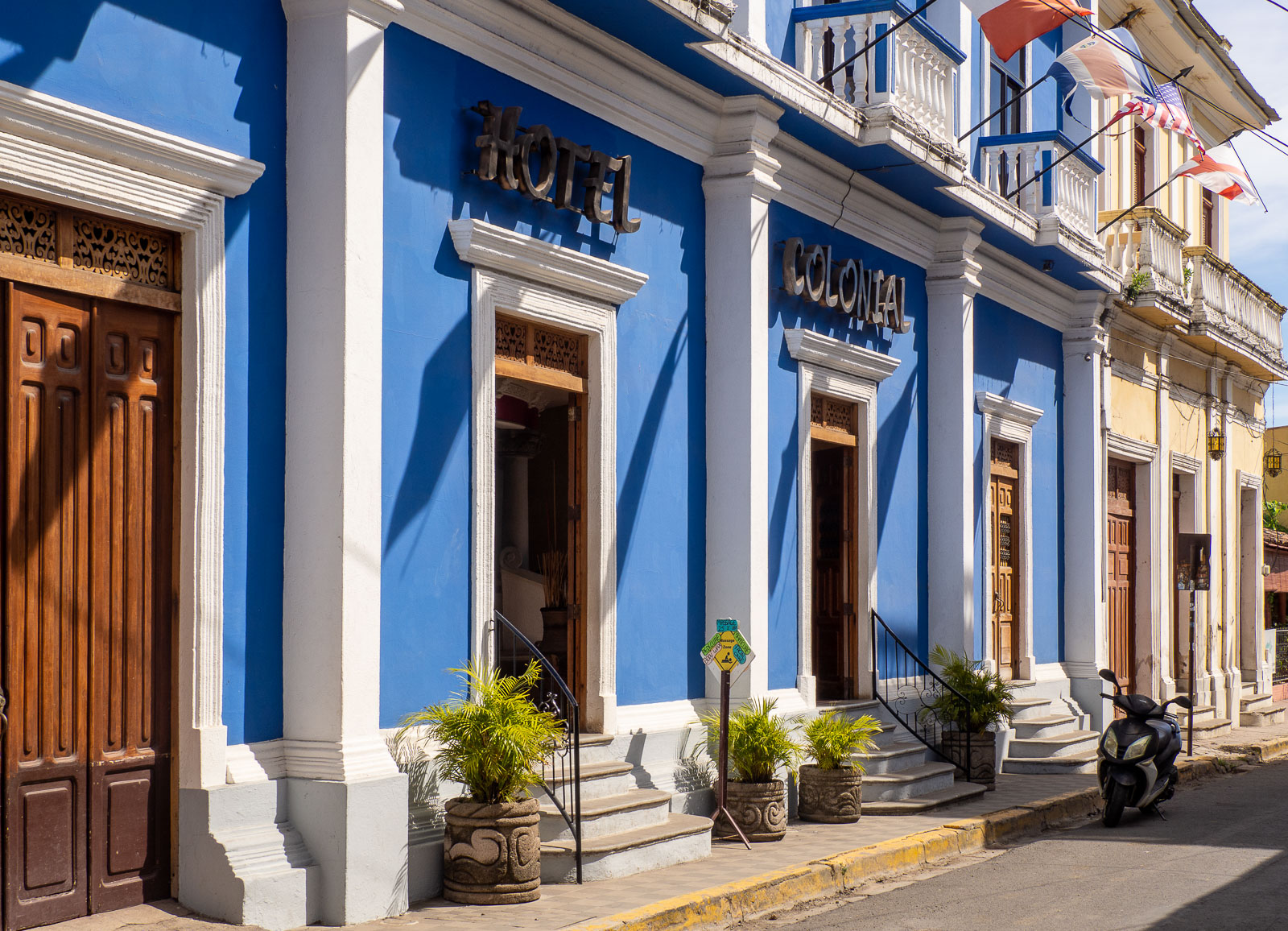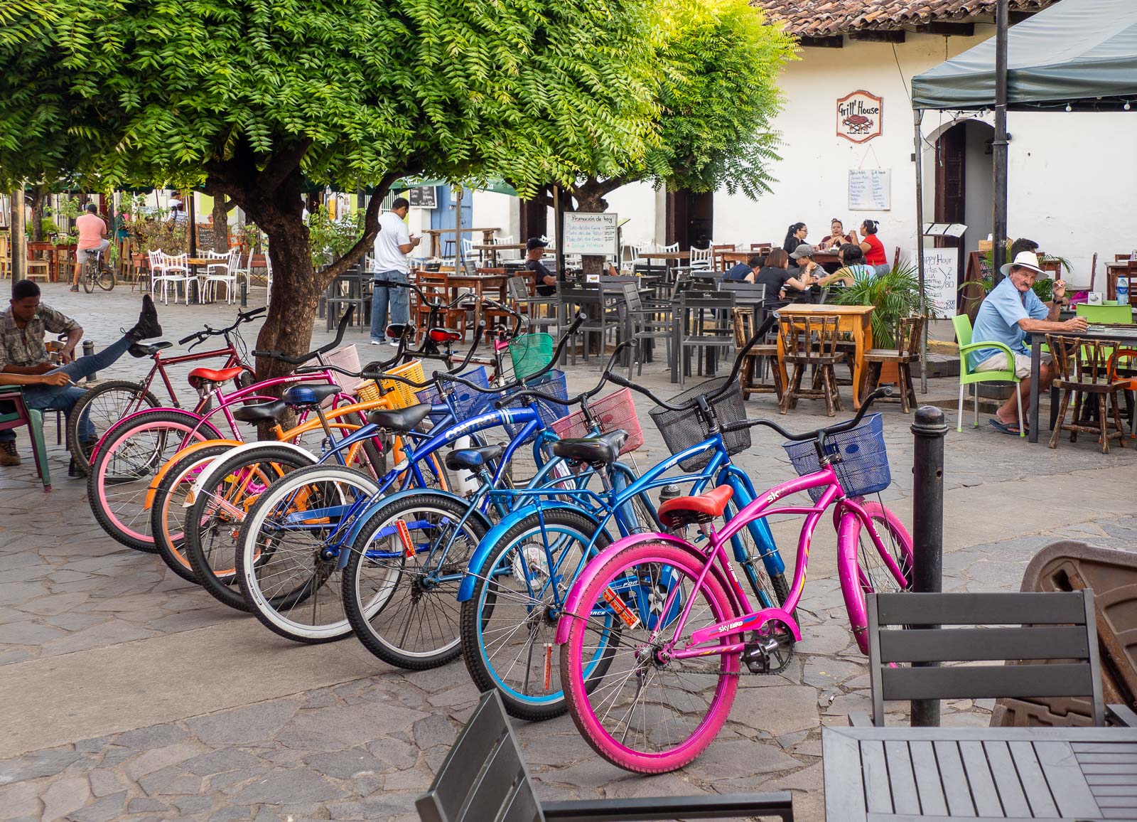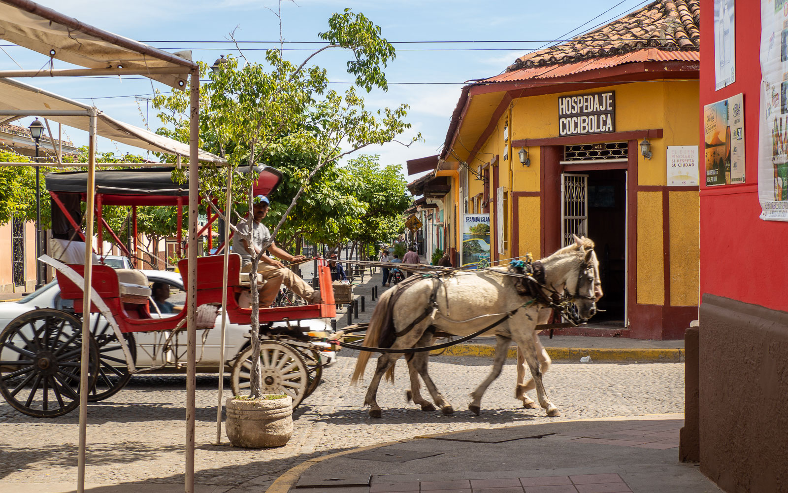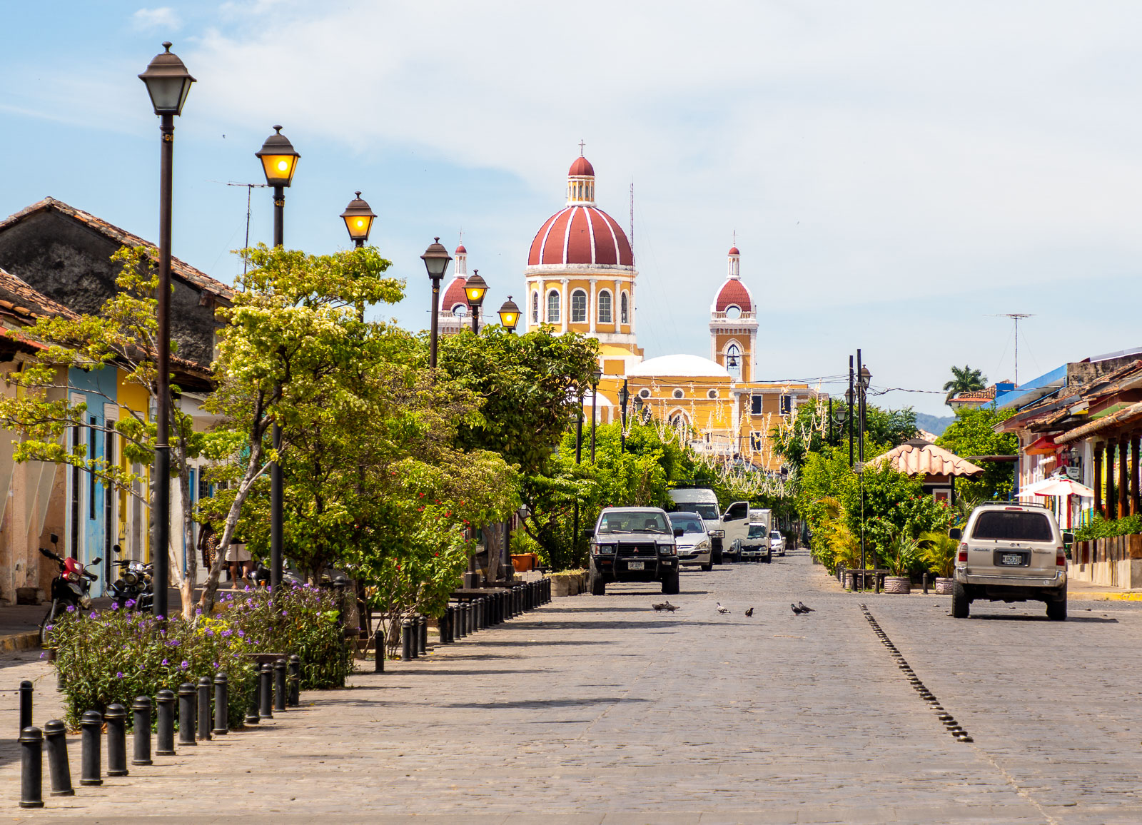 Päivällä, ennen ravintoloiden avautumista, Calle la Calzada, kaupungin pääkatu, on vielä hiljainen. Nicaraguan turistikato näkyy täälläkin. Huonot uutiset, Nicaraguan tapauksessa uutiset levottomuuksista vuonna 2018, leviävät maailmalle tehokkaasti. Se, että maassa on tätä nykyä taas ihan rauhallista, ei ole uutinen, eikä tieto siis leviä. Mutta turistit ovat palaamassa, ehkä parin vuoden päästä taas Granadassakin on ruuhkaista.