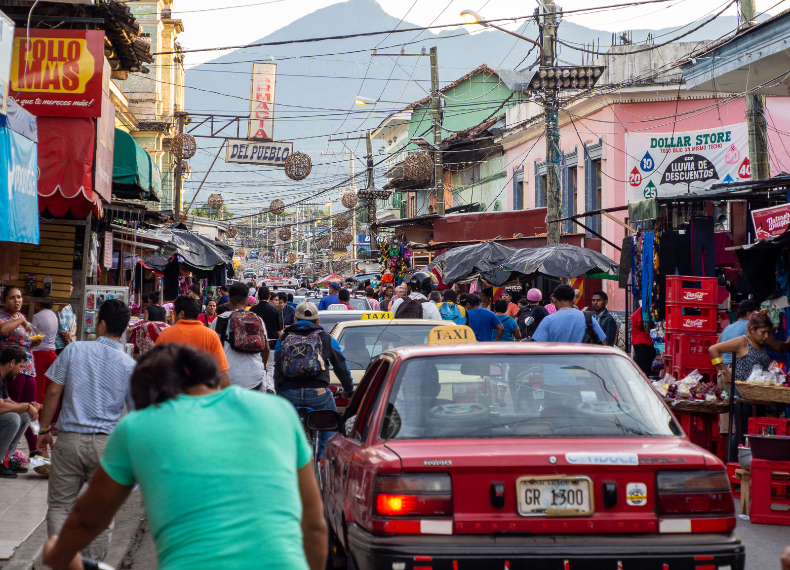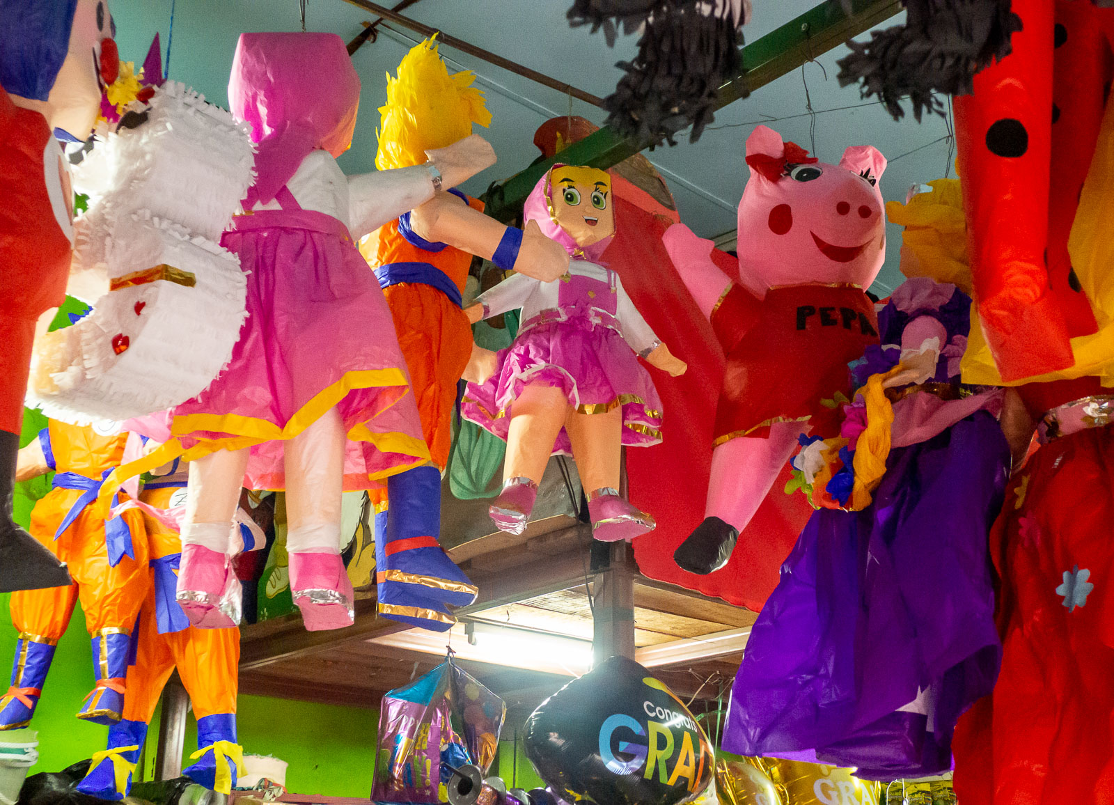 Myöhemmin iltapäivällä kävelemme vielä markkinakaduilla. Calle la Calzadan reunalla on kyllä matkamuistoja ja taidetta myyviä pieniä, hienojakin, liikkeitä, mutta paikalliset asioivat näissä kojuissa ja näiden katujen varsien pienissä, eurooppalaisittain vähän pimeissä ja nuhjuisissa kaupoissa. Samanlaisten kauppojen asettuminen vierekkäin toteutuu täälläkin, kiinnitämme San Juan del Surissa näkemiemme juhlien jälkeen erityisesti huomiota useampaan erikokoisia ja -näköisiä pinjatoja ja muita juhlatarvikkeita myyviin liikkeisiin. Juhlat ovat Nicaraguassa selvästikin iso juttu: ¡Feliz cumpleaños! Syntymäpäiväonnittelut!