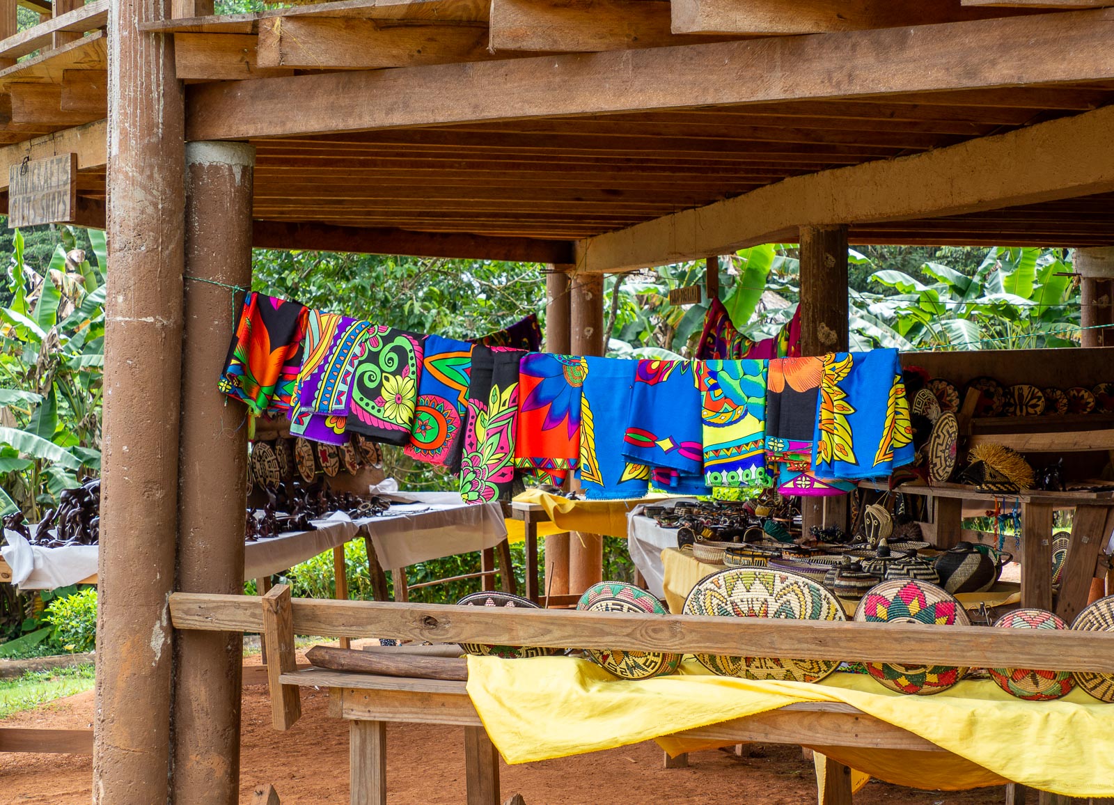 Tanssiesityksen jälkeen saimme ystävällisen kehotuksen vierailla heimon käsitöitä myyvässä majassa. Kaikki tuotteet valmistetaan tässä kylässä ja myyntituotot menevät kyläläisille. Panama oli kuitenkin pitkähkön kiertomatkamme ensimmäinen kohde, joten olimme, myös ryhmänä, ehkä tavanomaistakin haluttomattomampia ostamaan mitään lisää matkatavaroihimme kiertämään koko Keski-Amerikan. Hinnatkin olivat melko korkeita, kuten Panamassa yleensäkin – tosin en yrittänyt mitään todellista tinkimistä minkään esineen osalta.