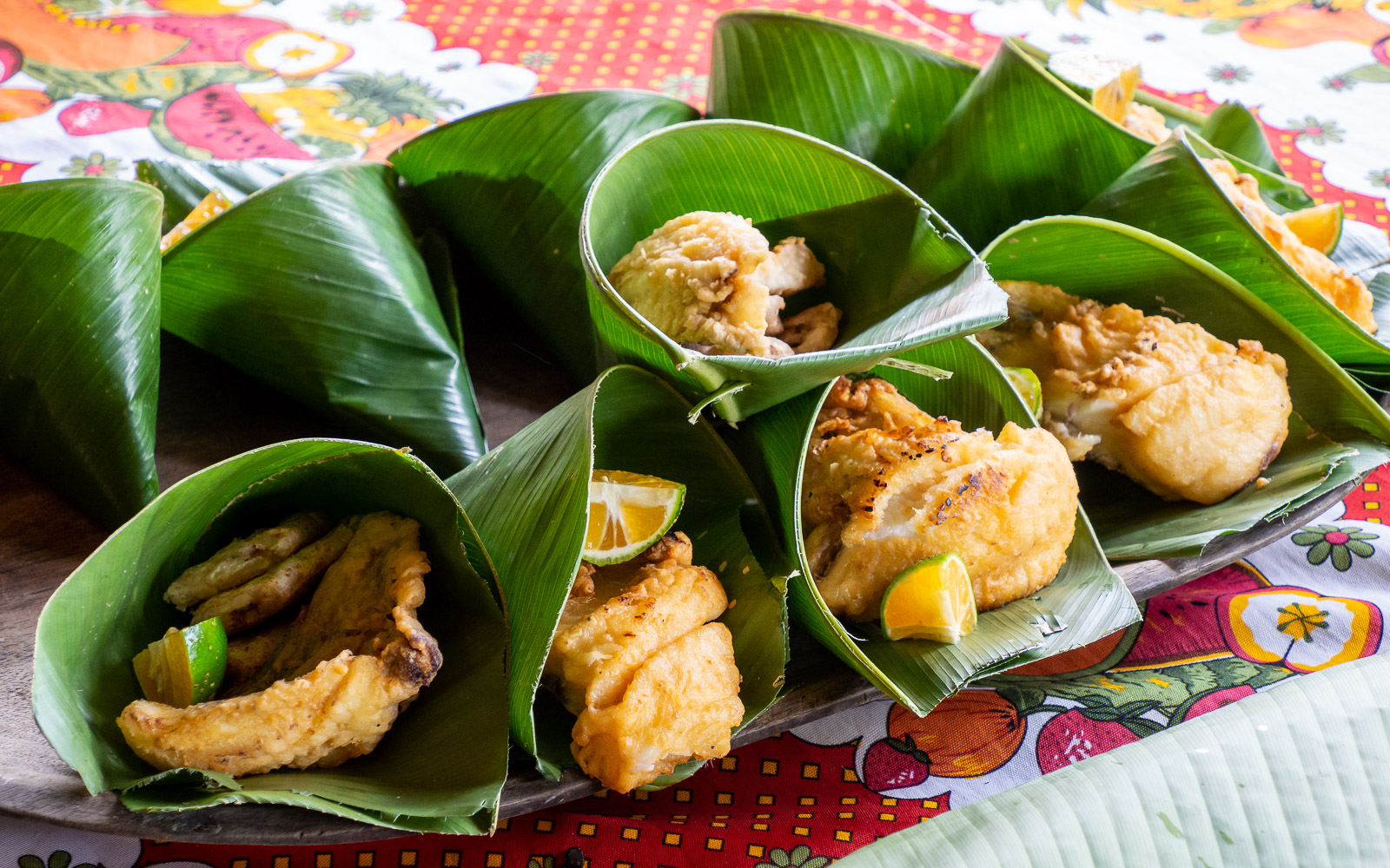 Vierailuohjelmaamme kuului myös kyläläisten meille valmistama lounas, joka koostui hedelmistä, riisistä ja kalasta. Jouduimme hetken odottelemaan lounasta, sillä ilmeisesti viimeiset tarvittavat kalat kalastettiin vasta saapumisemme jälkeen ja jossain vaiheessa ne kiidätettiinkin suoraan veneiltä keittiömajaan, eli ruoka todellakin oli tuoretta!