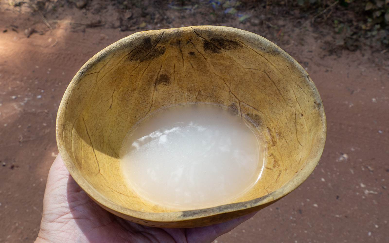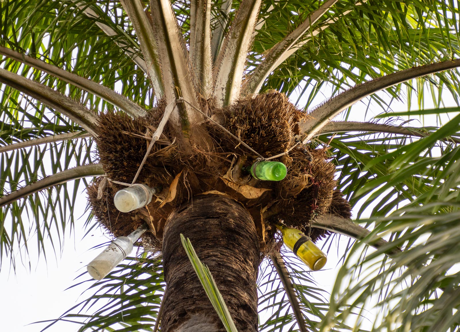 Satuimme myös näkemään miten palmuviinan valmistukseen käytettävää nestettä kerättiin palmun latvasta. Mies silppasi vauhdilla ylös palmuun, tyhjensi pulloihin kertyneen nesteen kanisteriin ja laskeutui palmusta yhtä kätevästi kun oli siihen noussut. Aikamoista akrobatiaa!
