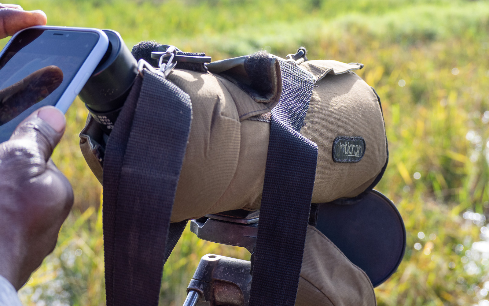 Oppaallamme oli linturetkeilyyn tarvittavat varusteet, kaukoputki ja kiikari. Kiikarin okulaarista saattoi myös ottaa kännykällä kuvia kauempana olevista linnuista, samaan tapaan kun Costa Ricassa kuvattiin laiskiaisia. Oli meillä kamerakin, Olympuksen 12-200 millisellä putkella, mutta etenkin pienempiin lintuihin se ei kyllä oikein riittänyt.