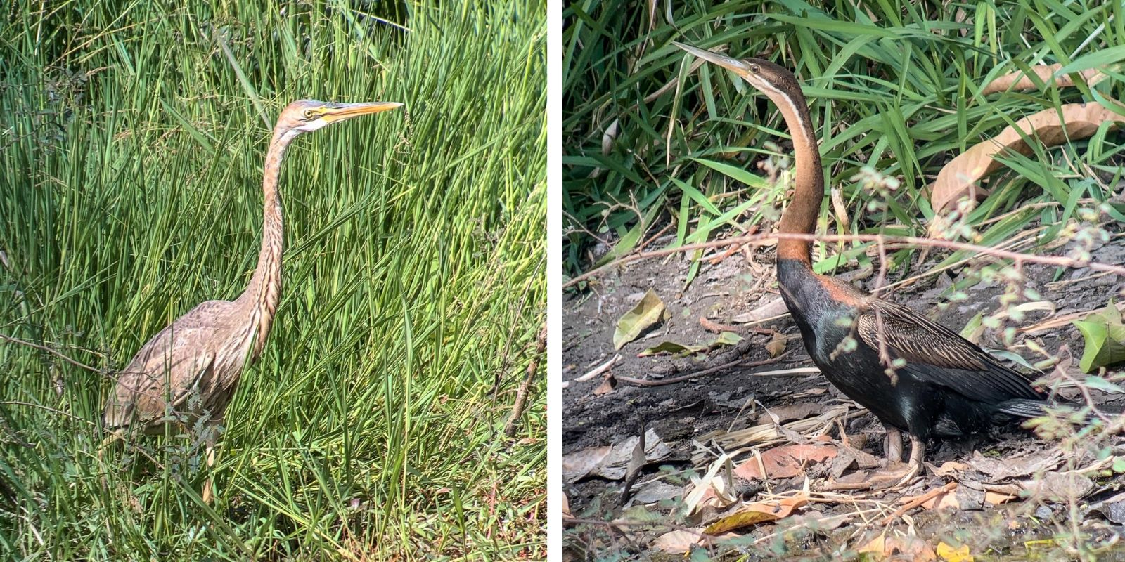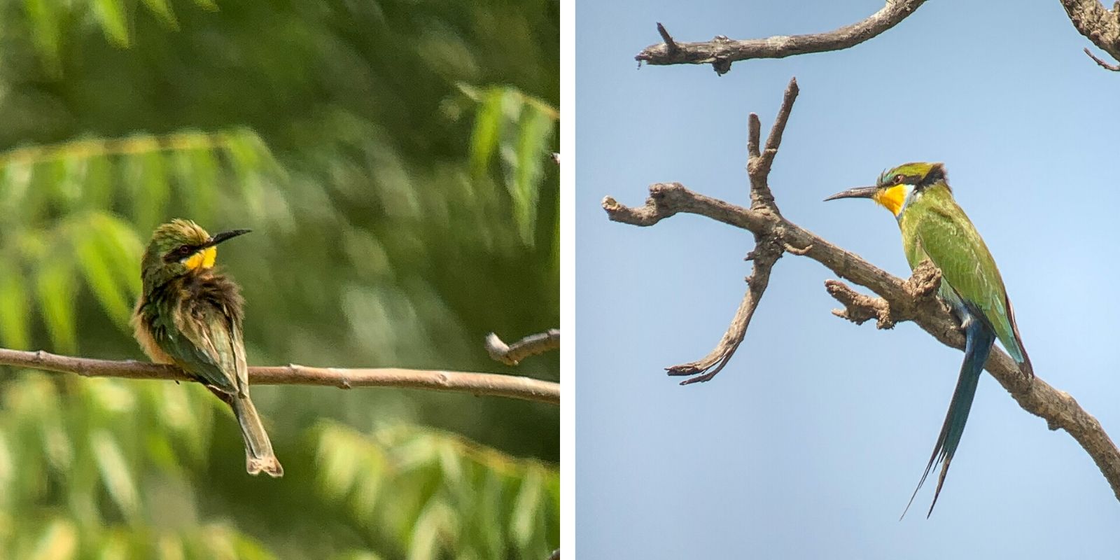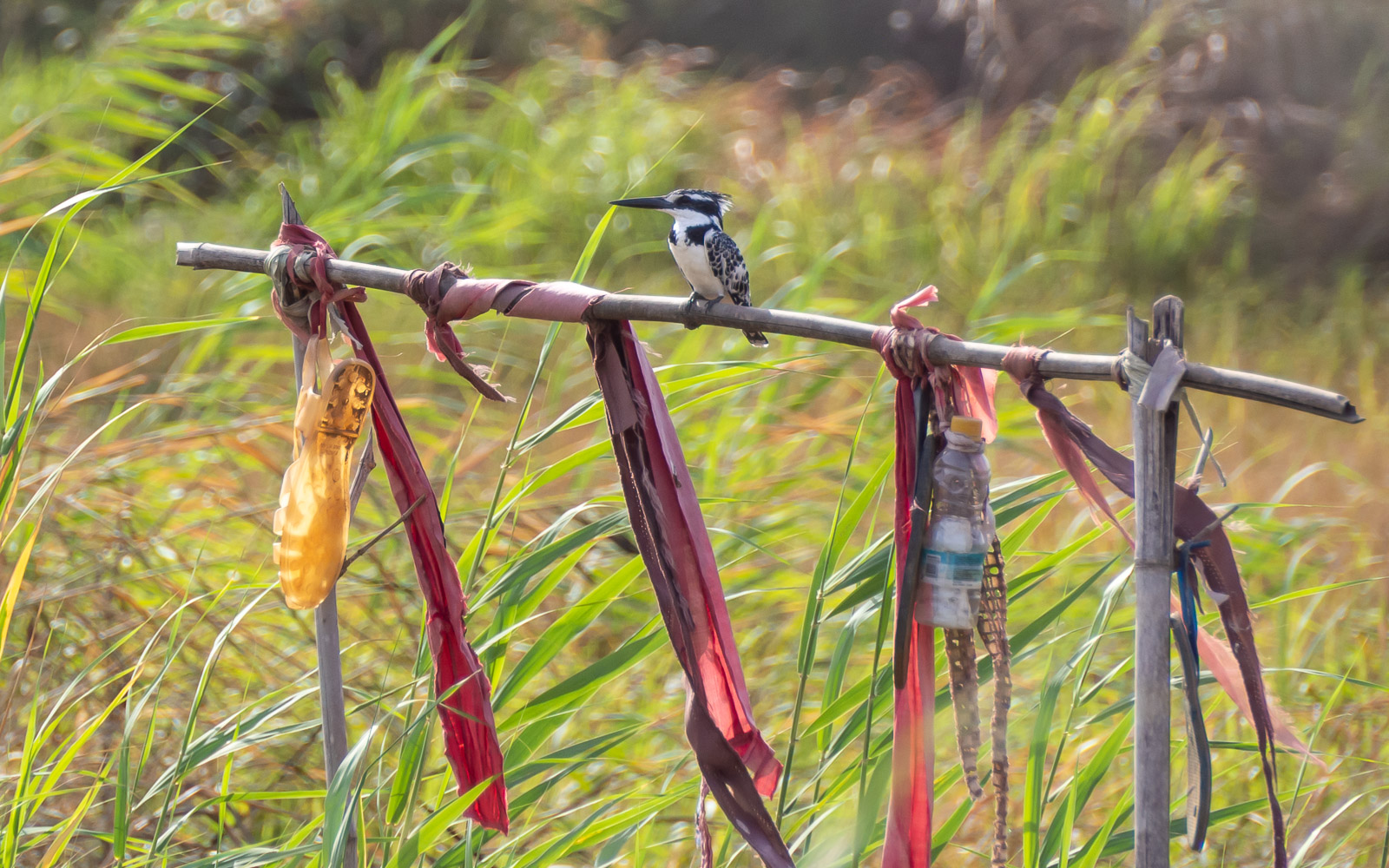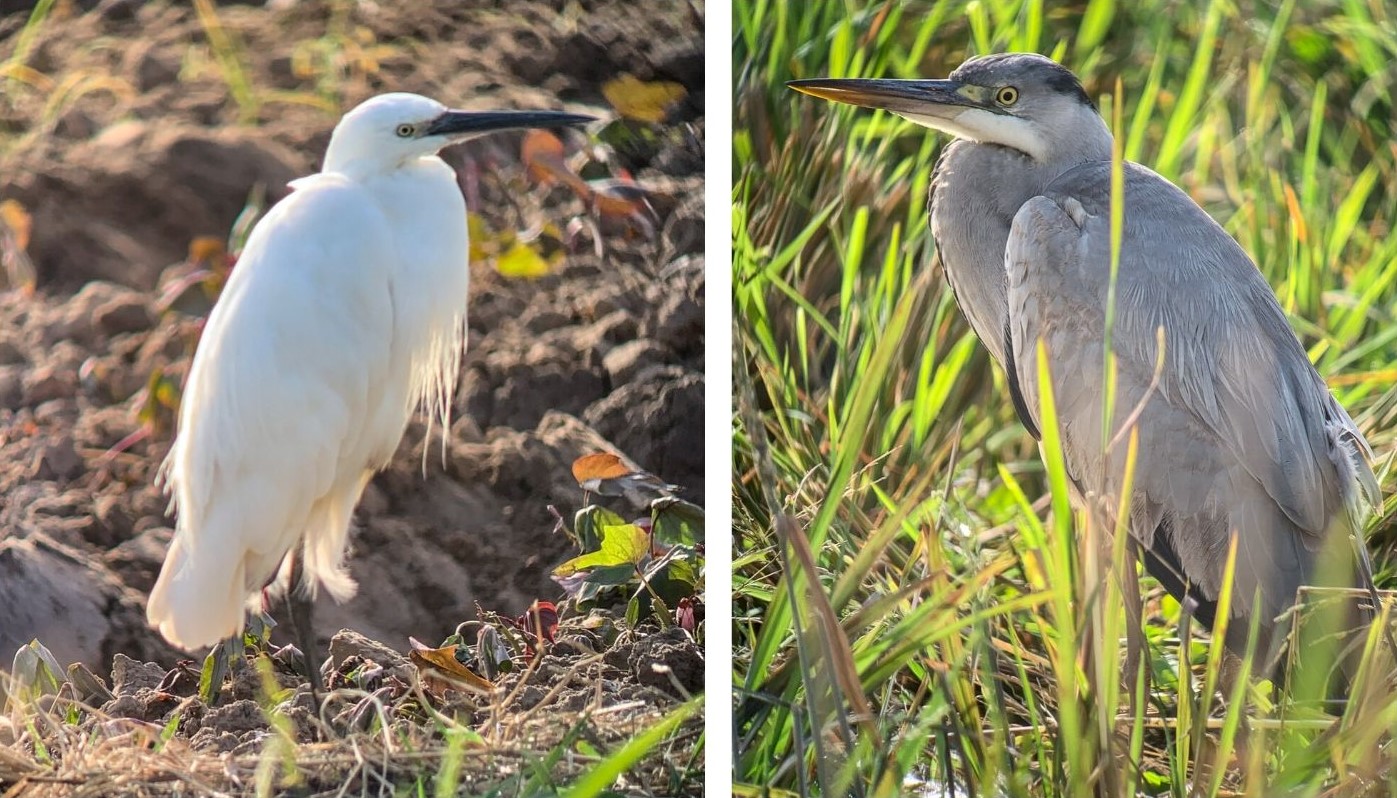 Aluksi näimme haikaroita ja muutamia kahlaajia. Pensaissa parveili myös värikkäitä mehiläissyöjiä. Näimme myös kirjokalastajan, jopa nappaavan kalan, mutta se tapahtui kyllä niin nopeasti, ettei se tallentunut kameraan! Vähän myöhemmin samainen kirjokalastaja uhmasi pelottomasti pellolle rakennettua linnunpelätintä.