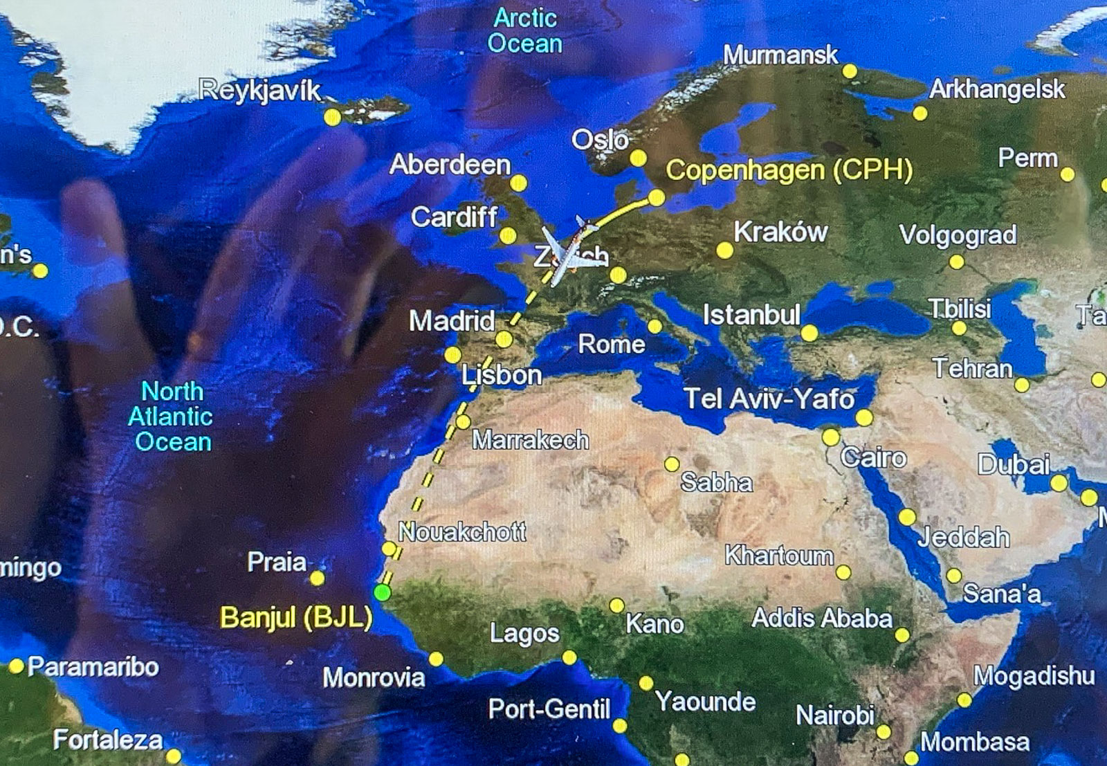 Valitsimme Tjäreborgin matkan pitkälti sen takia, että muita suoria lentoyhteyksiä ei Helsinki – Banjul -välillä olekaan tarjolla ja välilaskullisillakin lennoilla on useimmiten enemmän hintaa kuin pakettimatkan lennoilla ja hotellilla. Hiukan kuitenkin petyimme lentojen osalta sikäli, että lopulta lento ei ollut suora kumpaankaan suuntaan. Varausvaiheessa kerrottiin päivälennon pistäytyvän matkalla Kööpenhaminassa, mutta muutama viikko ennen lähtöä saimme tiedon, että paluun yölentokin poikkeaa aikaisin aamulla Kööpenhaminassa. Tanskassa ei kuitenkaan tarvinnut/saanut poistua koneesta, joten välilaskut hoituivat n. tunnissa, mutta etenkin paluulennolla se kuitenkin pätki lentomatkaa siten, että nukkuminen jäi aika vähäiseen.