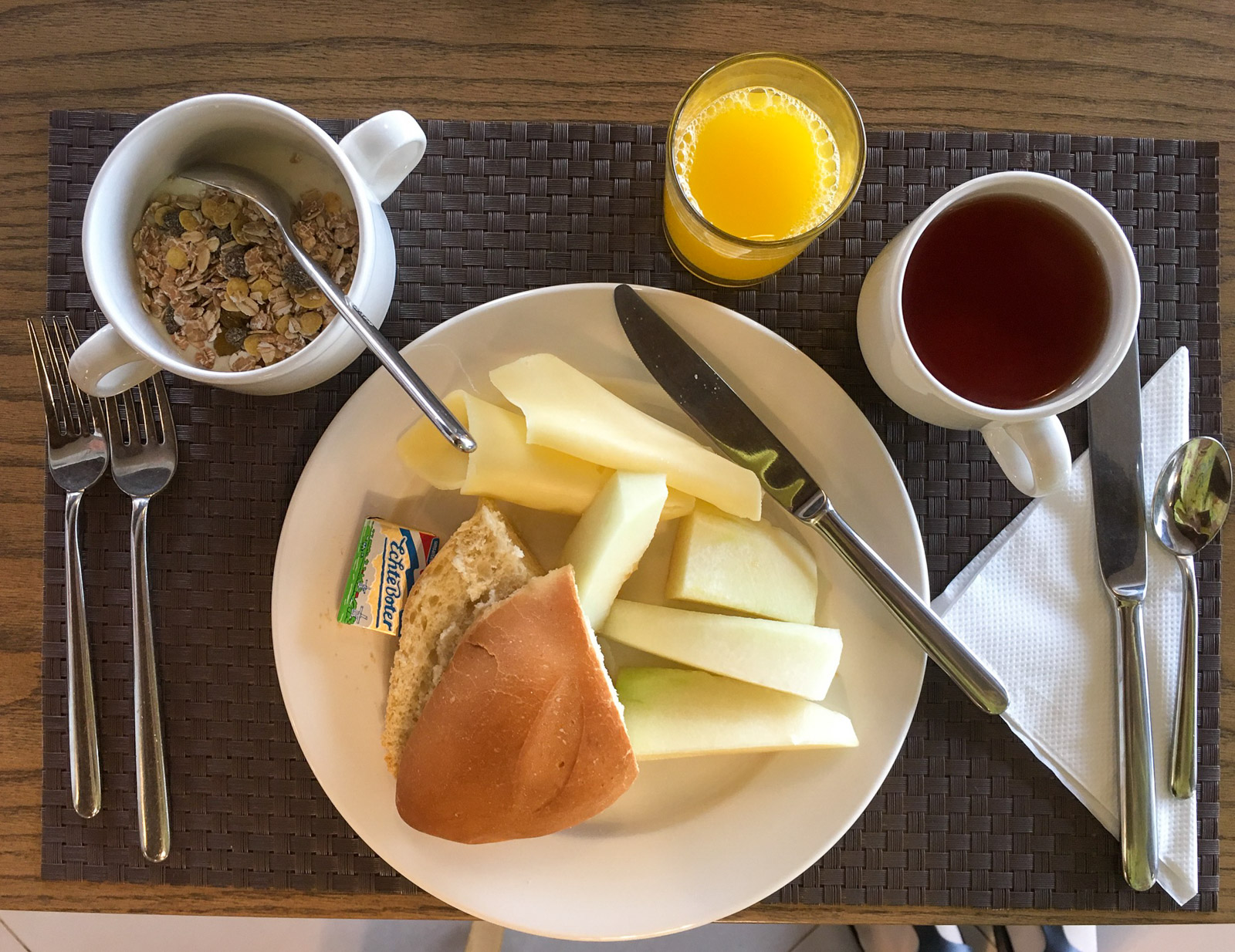 Aamiaisbuffet kuului hintaan, mutta kahtena päivänä lähdimme retkelle ennen sen aukeamista, jolloin saimme hotellilta mukaan aamiaispaketit, joiden sisällössä ei kuitenkaan ollut hurraamista (valkoista leipää, pari juustonsiivua, keitetty kananmuna, banaani ja omena tai muffinsi). Aamiaisbuffet ei sekään nyt ollut ihan länsimaista 4 tähden tasoa, mutta kyllä sillä puoli päivää tuli toimeen.