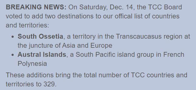 Joulukuussa Travelers’ Century Club kertoi, että Etelä-Ossetia ja Austral-saaret on lisätty aluelistaan ja näiden myötä TCC-alueita on tätä nykyä 329.