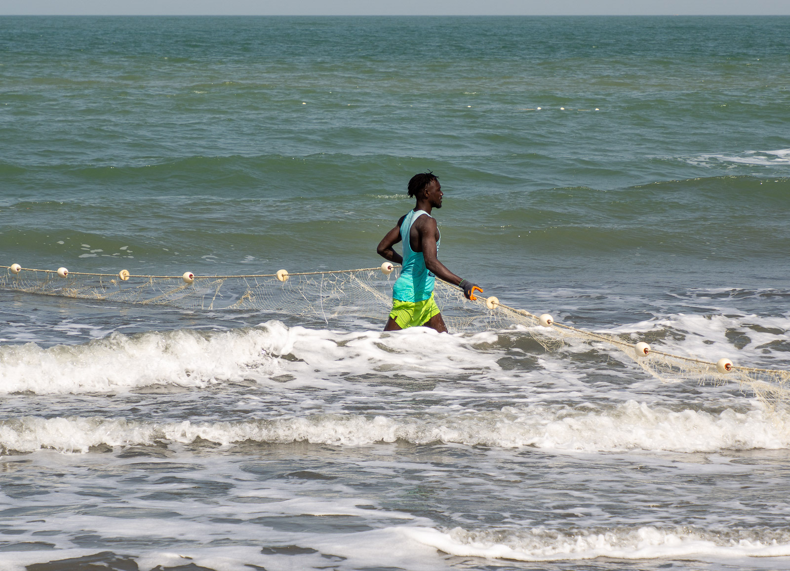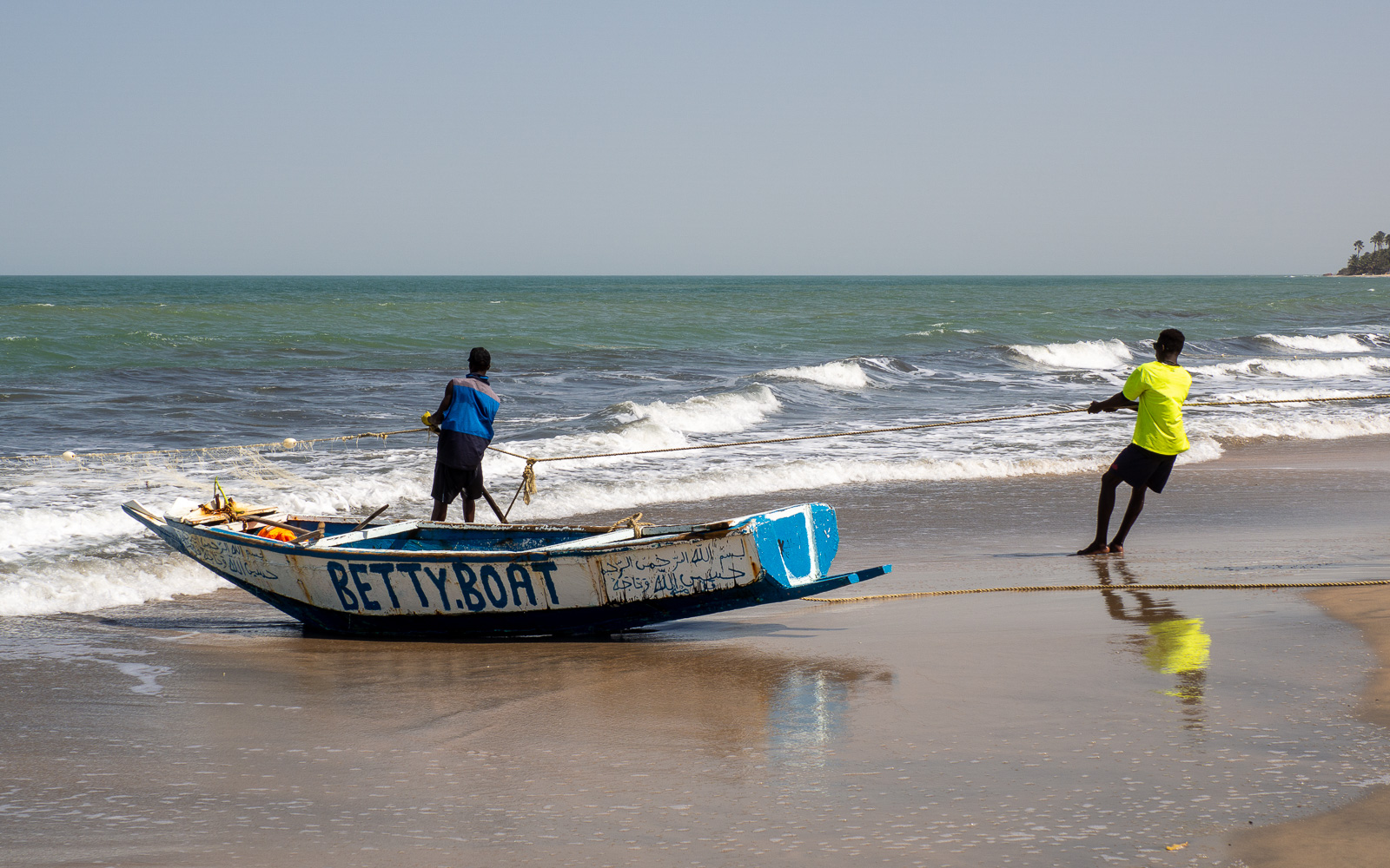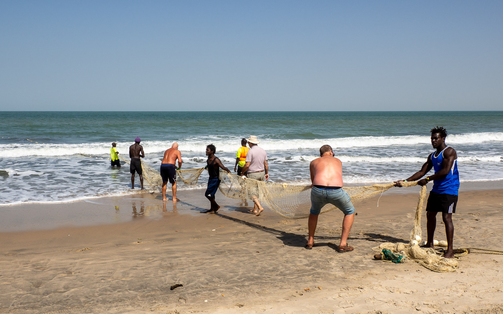 Matkalla pohjoiseen, Kotun käsityömarkkinoita etsiessämme, rannan katkaisee pieni virta, jonka syvyys ja virtauksen voimakkuus vaihtelee vuoroveden mukaan. Tuona aamuna yli olisi päässyt kahlaamalla noin metrin syvyydessä, mutta emme olleet uimapuvuissa liikkeellä, joten olimme tyytyväisiä siihen, että paikalliset tarjosivat pientä palkkiota vastaan venekyydin virran yli. Muutenkin rannalla oli mielestämme kivampi kävellä kun sillä oli hiukan elämää ja sen myötä tarkkailtavaa, kuten vaikka kalastajat. Täälläkin, kuten etelämmässä Guineanlahden rannalla yli vuosi sitten, myös innokkaimmat turistit liittyivät joukkoon ja auttoivat verkon vetämisessä.