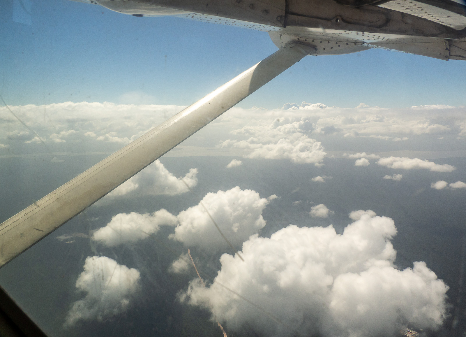 Hiukan ennen kahta iltapäivällä pääsimme kuitenkin ahtautumaan Trans Guyana Airways -yhtiön pieneen Cessnaan, koko 12 hengen seurueemme. Osalle meistä kyseessä taisi olla ensimmäinen lento pienkoneella, mutta me olimme jo useammankin pääosin Karibian alueella lennetyn lyhyen lennon myötä melkein konkareita lajissa. Onnistuin menomatkalla pääsemään etupenkkiin heti tyhjäksi jääneen perämiehen paikan taakse ja seurailinkin mielenkiinnolla paitsi alla aukeavia maisemia myös perämiehen mittareita. Usein pienkoneissakin on sekä lentäjä että lentoperämies, mutta tällä kertaa Kaieteurille lennettiin yhden hengen miehistöllä.