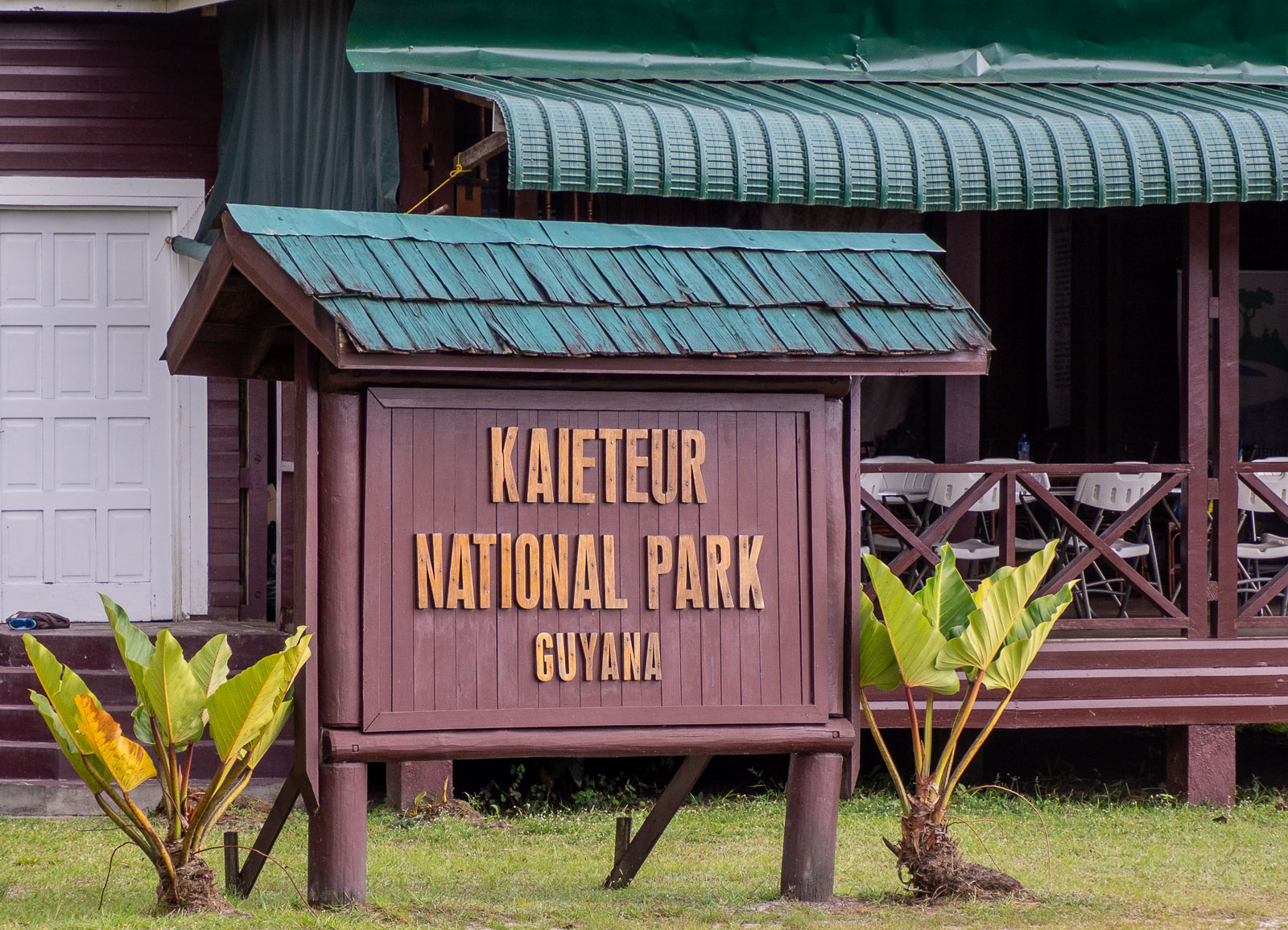 Ollakseen keskellä ei mitään Kaieteurin luontokeskus oli yllättävänkin iso. Tilaan mahtui pieni puistoa esittelevä näyttely, wc-tilat, ja – luonnollisesti – matkamuistomyymälä. Emme kuitenkaan jääneet taloa sen pitempään ihmettelemään, sillä aikaa oli niukasti ja matkaa putouksille jonkin verran. Alunperin ajatuksena oli ollut vierailla kolmella näköalapaikalla, mutta koneen odotettua hetken sään selkenemistä Georgetownissa kävelyretki luonnonpuistossa oli lyhennetty vierailuksi kahdella näköalapaikalla: Partiopoikien näköalapaikalla (Boyscout’s View) ja Sateenkaaren näköalapaikalla (Rainbow View).