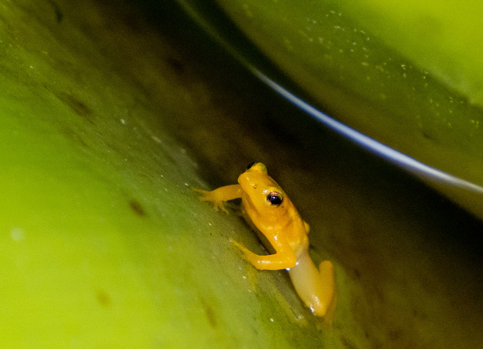 Aikamme putousta katseltuamme yksi jos toinenkin meistä saattoi jo keskittyä luonto-oppaan muihinkin tarinoihin. Vaikka tarinoihin Kaieteurin aluelle, ja vain siellä, esiintyvistä pienen pienistä sammakoista, jotka elävät koko elämänsä ananaksensukuisen kasvin lehtien välissä. Tässäkin kohdin oppaasta oli iloa, sillä tuskin monikaan meistä olisi näitä sammakoita muuten osannut etsiä, löytämisestä puhumattakaan!