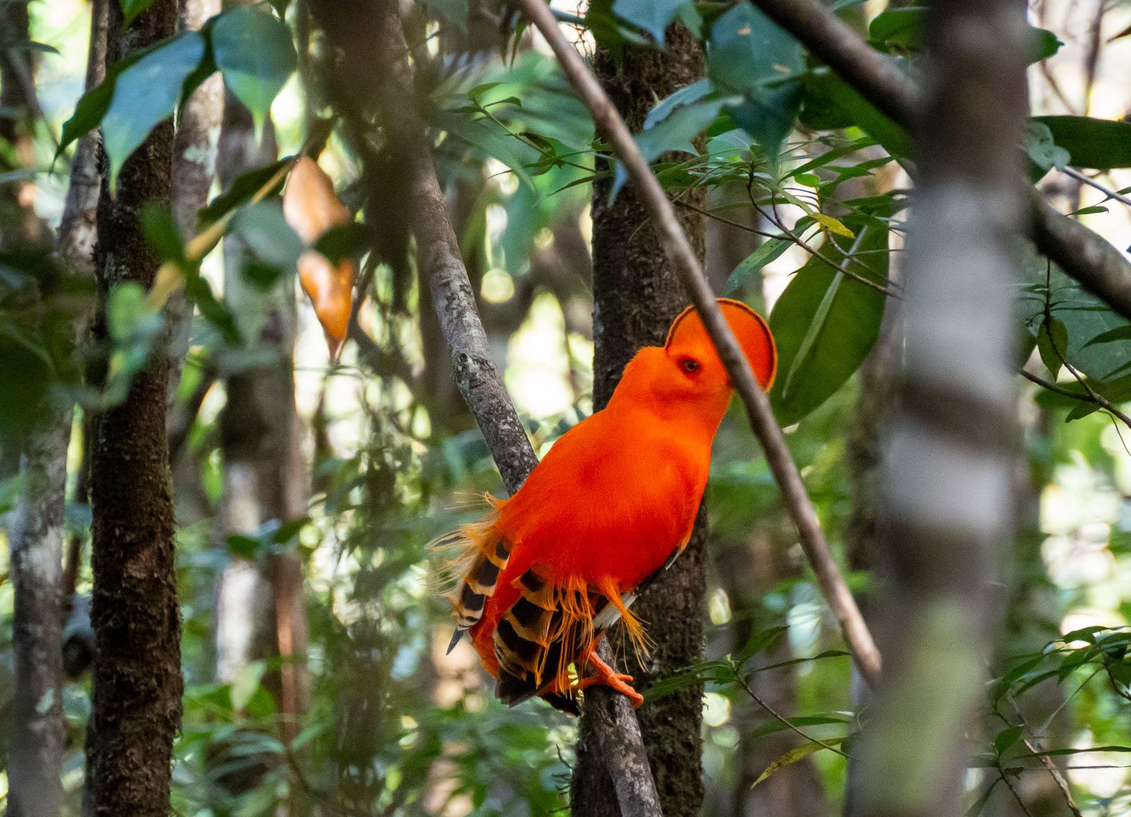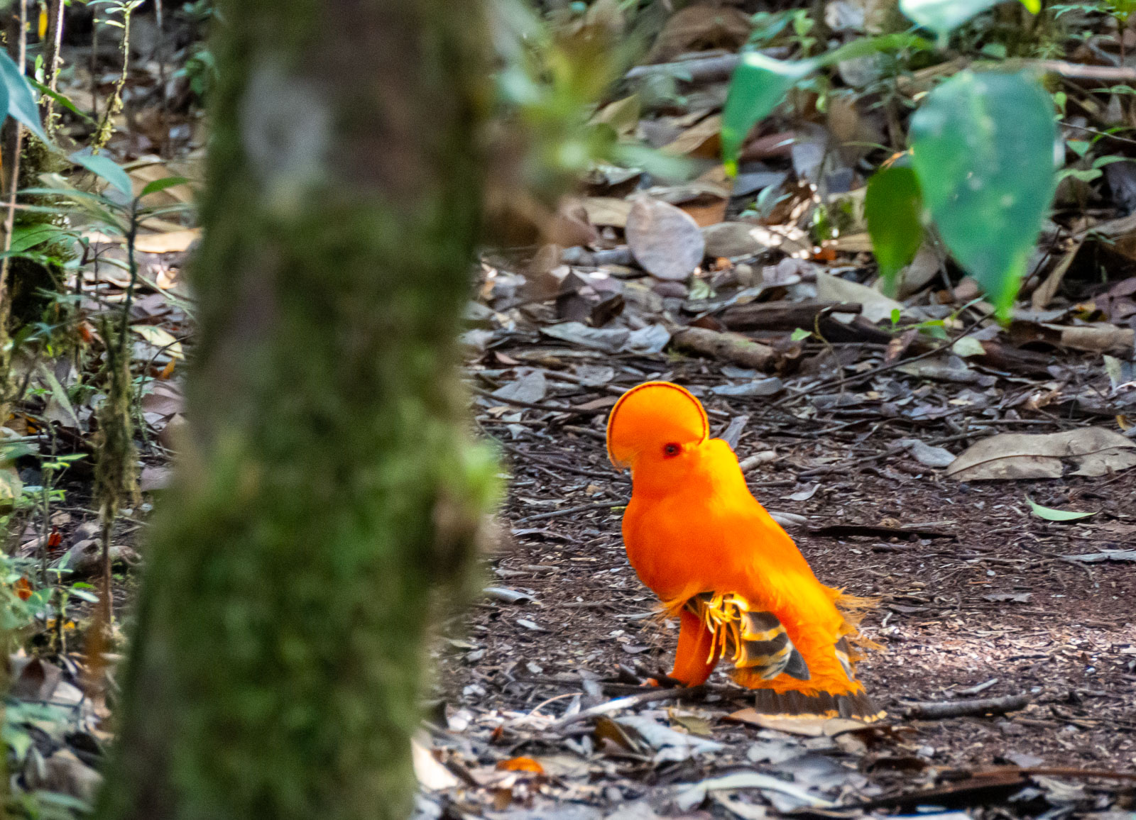 Paluumatkalla ohitimme myös pienen metsäalueen, jonne luonto-oppaat tuovat ruokaa oranssiharjakotingoille, englanninkieliseltä nimeltää Cock of the Rock. Wikipedia väittää näitä varpuslinnuiksi, mutta loistavan oranssiset linnut olivat kyllä mielestäni kaukana varpusista!