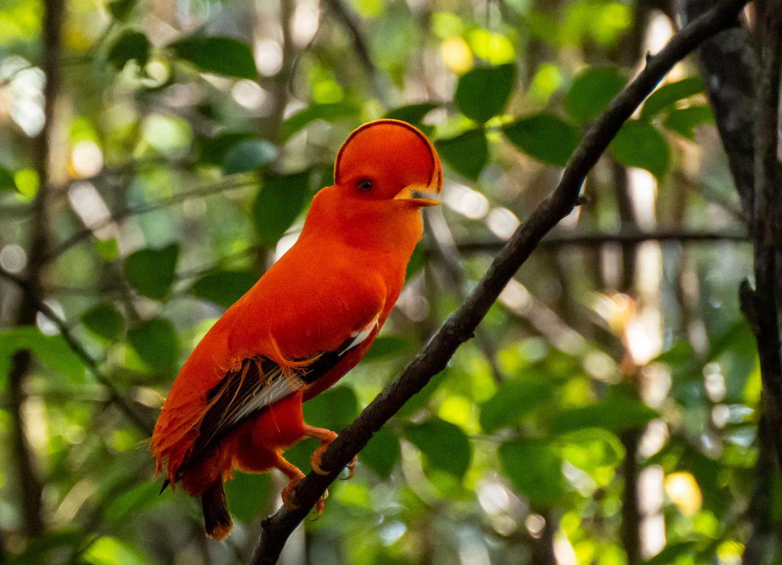 Kuten vapaana liikkuvat linnut aina, nämäkin oranssiharjakotingot olivat melko haastavia kuvauskohteita. Vaikkakin niille tuodaan tietylle alueelle ruokaa ja niitä siis suurella todennäköisyydellä siellä näkee, niin ne ovat metsässä vapaina – samaan tapaan kuin värikkäät papukaijat Copanin raunioilla.
