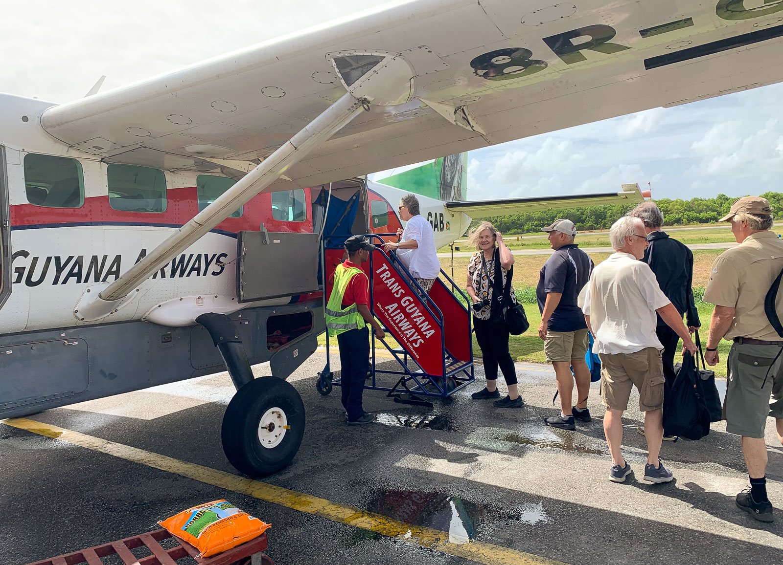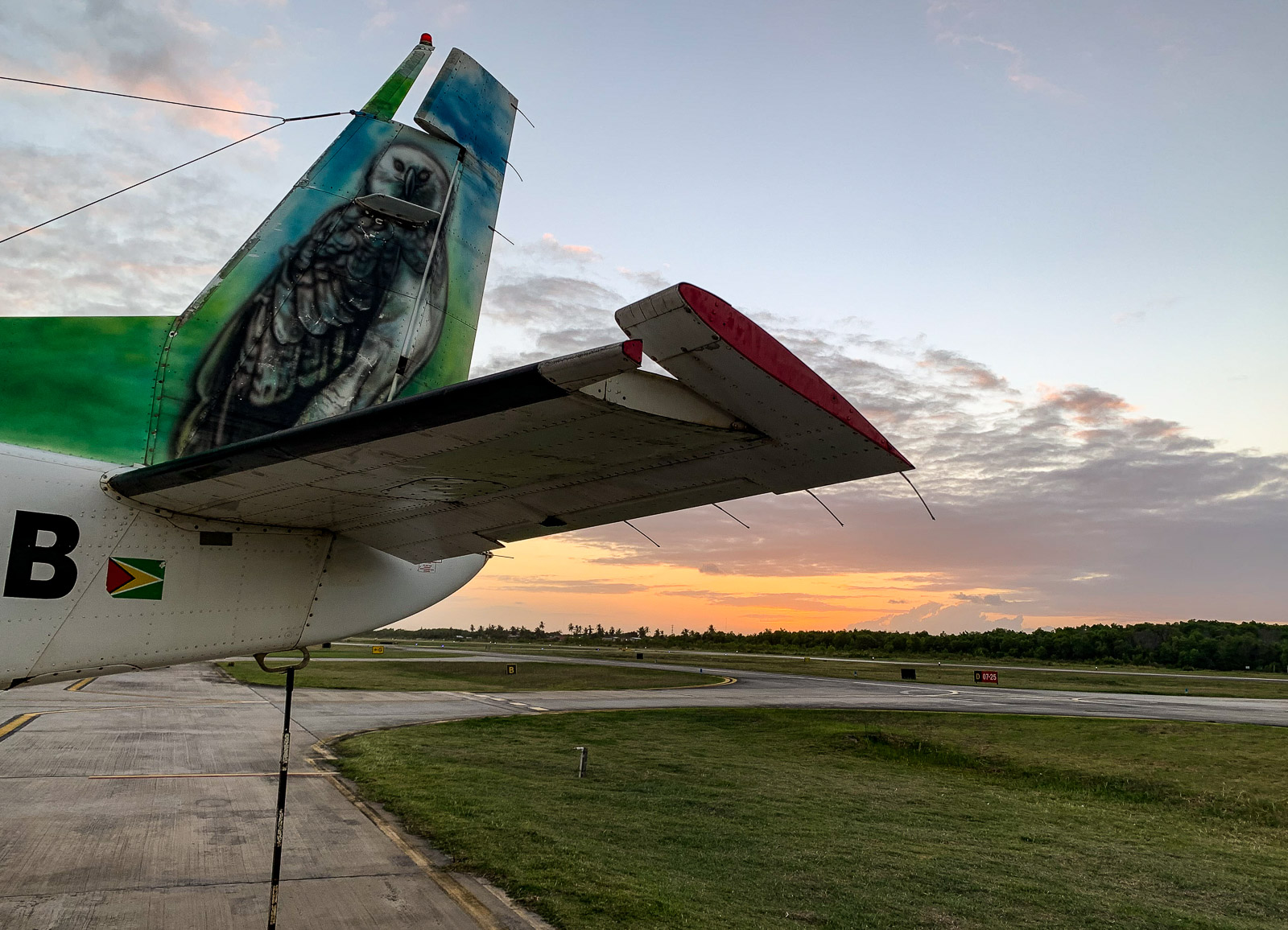 Lentäminen vaatii jotenkin kohtuulliset olosuhteet, joten retken toteutuminen on aina säästä kiinni. Kiertomatkallamme Kaieteurin retkelle oli varattu tasan yksi päivä ja seuraavana päivänä matkamme jatkuisi Trinidadiin ja Tobagoon, joten aamulla hiukan jännitti, että mitenkähän retken käy. Edellisenä iltana säätiedotus lupasi iltapäiväksi hienoista sadetta ja vielä aamupäivälläkin, kun lähdimme pienelle Eugene F. Correiran lentokentälle, tilanne näytti hiukan epävarmalta. Lentokentällä saimme alustavan tiedon, että lento kyllä lähtisi, mutta tunnin myöhässä. Edelleen hiukan jännitti, sillä kyseessä on päiväretki ja jos lähtö venyisi vielä tuosta, niin perille ei jäisi juurikaan aikaa ennen kuin pitäisi jo lähteä takaisin.
