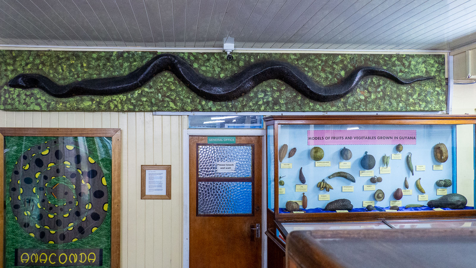 Luonnontieteellinen museo kuullostaa ehkä tylsältä paikalta erityisesti tropiikissa, kun ulkona paistaa aurinko, mutta kahlattuamme läpi täytetyt linnut museo sen kuin parani. Seinälle lätkäisty anakonda oli jo ihan mielenkiintoinen. Surinamen Paramaribosta Ranskan Guyanan rajalle ajaessamme tulivat anakondat puheeksi ja oppaamme kertoi, että sadekaudelle juuri tällä samaisella tienpätkällä saattaa hyvällä tuurilla joutua useammankin kerran pysähtymään anakondan takia. Käärme on sen verran paksu, ettei sen yli parane ajaa – tulee nimittäin aika pahaa sotkua auton alustaan. Kymmenmetriseksikin kasvava käärme on myös sen verran pitkä, että se sulkee tehokkaasti tien koko leveydeltä.