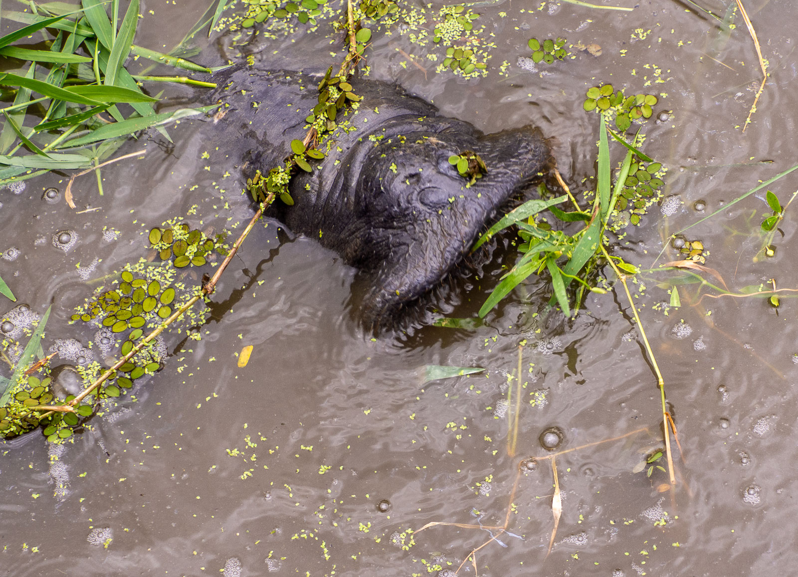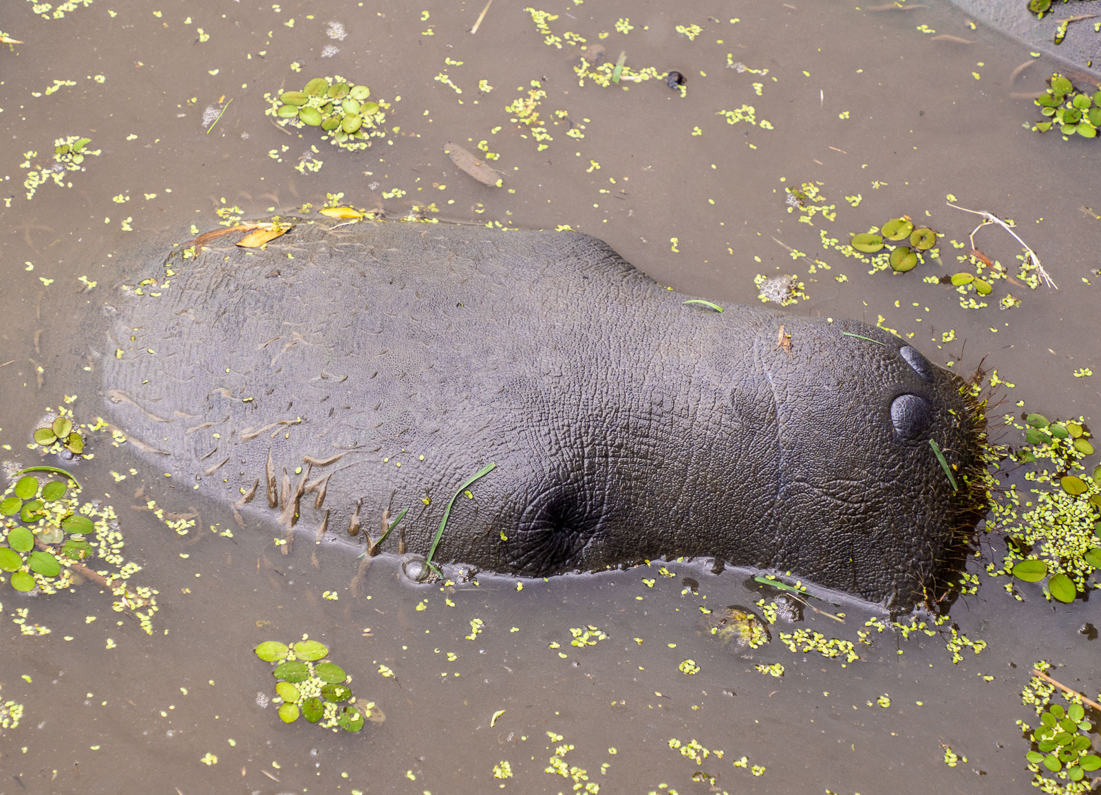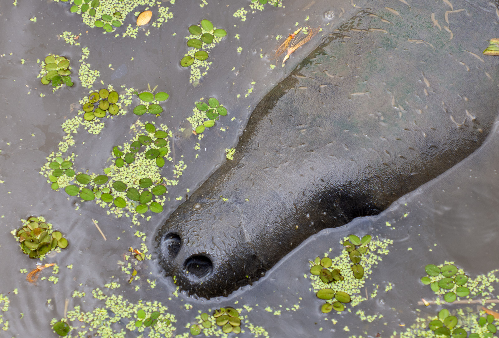 Jättiläislaiskiaisesta huolimatta jännittävin eläin Guyanassa löytyi sittenkin pinnan alta. Tai siis, emme me siellä pinnan alla käyneet vaan odottelimme toiveikkaasti, että näyttäytyisivätkö kasvitieteellisen puutarhan isossa, harmittavan tummavetisessä lammikossa asustelevat manaatit meille. Paikallisoppaamme tiesi, että tarjoamalla eläimille vihreää ruohoa ne saisi pintaan ja haali altaan lähistöltä ruohotuppoja ja toimivathan ne. Yksi jos toinenkin manaatti alkoi hamuta ruohoa hassun tylpällä kuonollaan. Vähän ajan päästä pieni lauma innostui enemmänkin ja pääsimme jo näkemään manaattien pienet silmätkin. Myöhemmin etsin netistä tietoa manaateista, joita en tätä ennen ollut koskaan ennen nähnyt, ja vasta siinä kohtaa näin, että näillähän on neljä jalkaakin ja ne ovat kuin vaikka pieniä virtahepoja olemukseltaan, jos olisimme ne kokonaan nähneet.