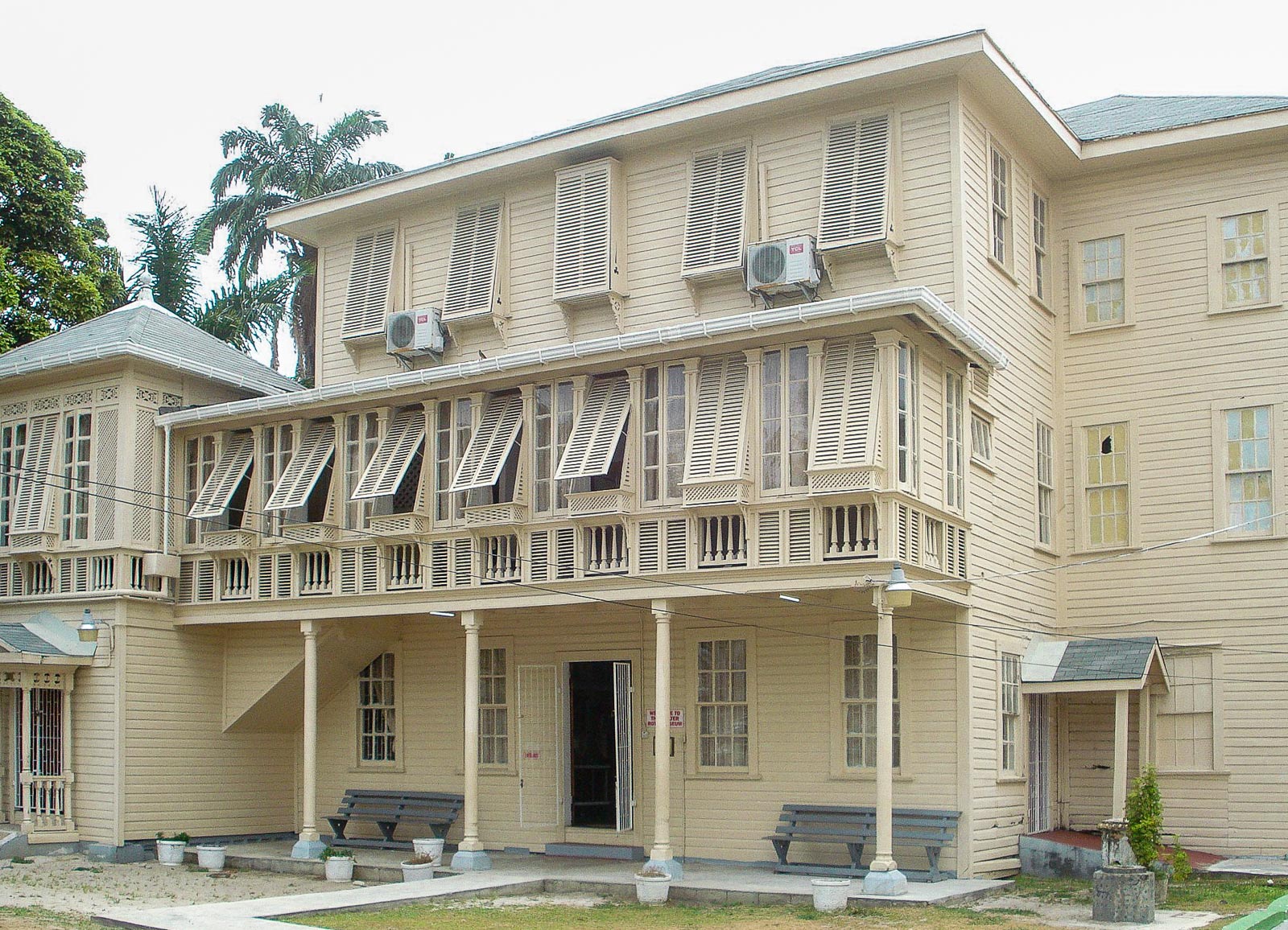 Luonnontieteellisen museon ja sen vetonaulan, jättiläislaiskiaisen replikan, mainitsinkin jo edellisessä jutussa. Kävimme myös pienessä antropologisessä museossa, joka sekin oli ihan vierailun arvoinen, jo rakennuksenakin. Kuten hotellissamme, tässäkin rakennuksessa, oli vanhanaikaiset ikkunat, joiden alaosassa oli jäälaatikot. Näitä ilmastointikoneiden edeltäjiä en ollutkaan ennen Guyanaa nähnyt missään. Ideana siis, että kun laatikko ikkunan alla täytettiin jäillä, niin jään sulaminen viilentää ilmaa huoneessa.