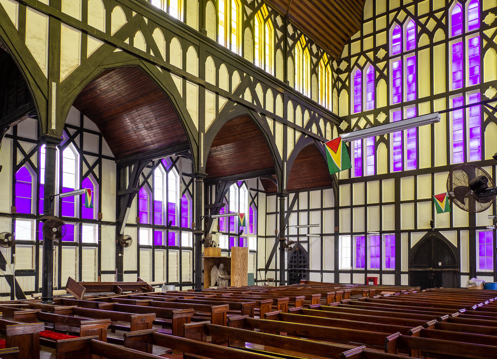 Georgetownin kirkot olivat jo lähtökohtaisesti tällä kertaa vähän altavastaajina, sillä kiersimme eri uskontokuntien kirkkoja monikulttuurisen Surinamen Paramaribossa, että kirkkokiintiömme oli melko täynnä. Lisäksi Paramaribon isoa puukirkkoa on vaikea ylittää. Mutta ok, käytiin nyt sitten kuitenkin katsomassa parhaillaan restauroitavana ollut St. Georgen kirkko ja seisottiin kadunkulmassa ihan turhan kauan yrittäen kuvaa St. Andrewn kirkosta siten, ettei sen eteen osunut yhtään rekkaa tai muuta isompaa autoa.