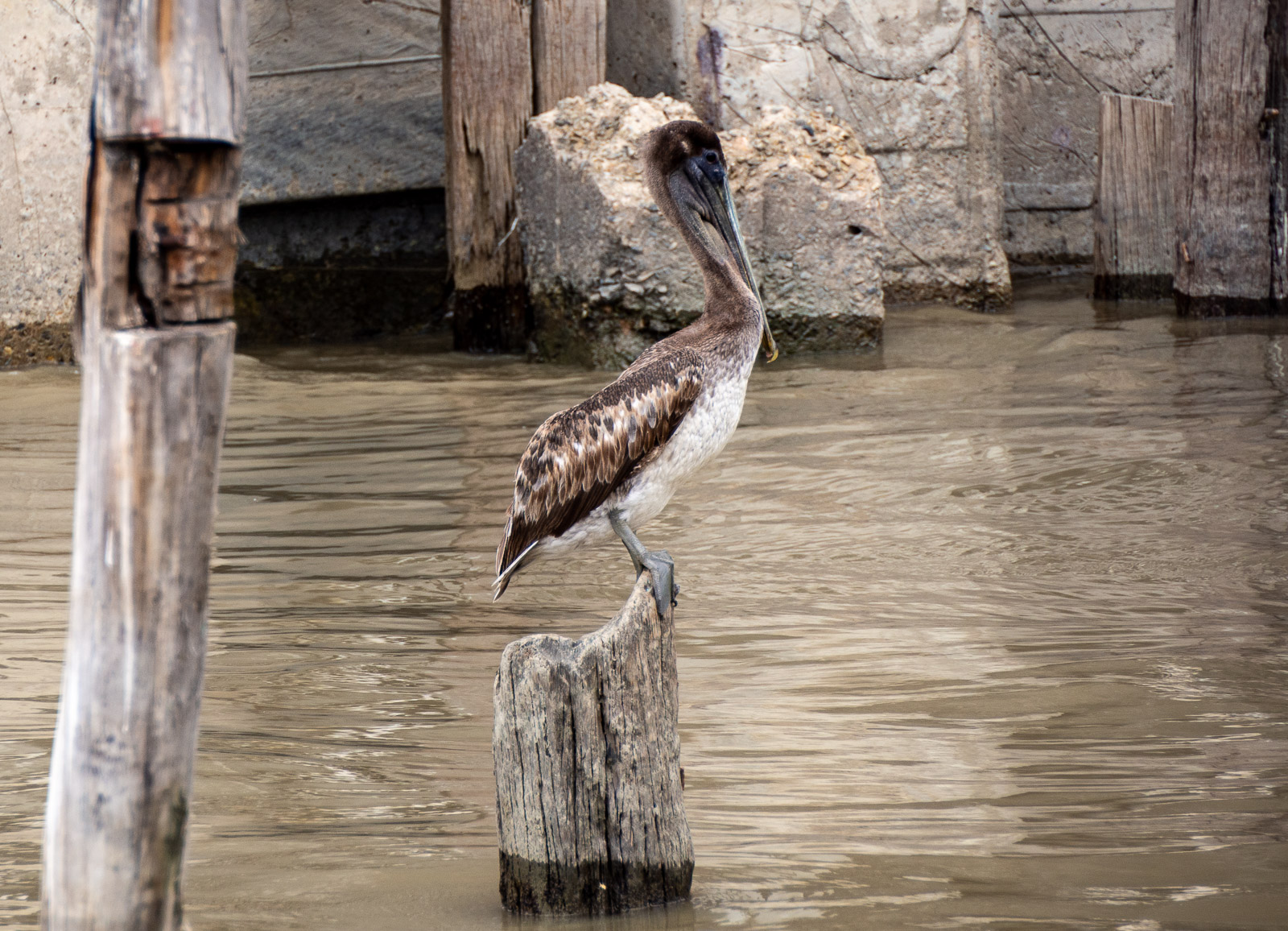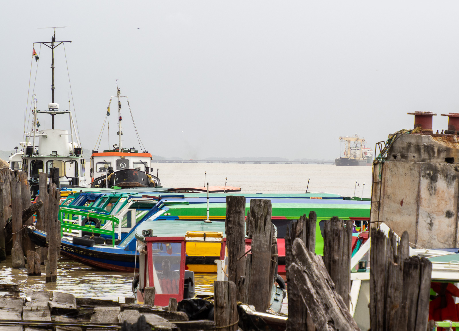 Rantakojuista oli myös näkymä hieman kauempana sijaitsevalla Demeraran kelluvalle sillalle, jonka pari ponttonia pystytään tarvittaessa vetämään siten sisään, että isommatkin laivat voivat sillasta huolimatta kulkea Demerara-jokea pitkin.