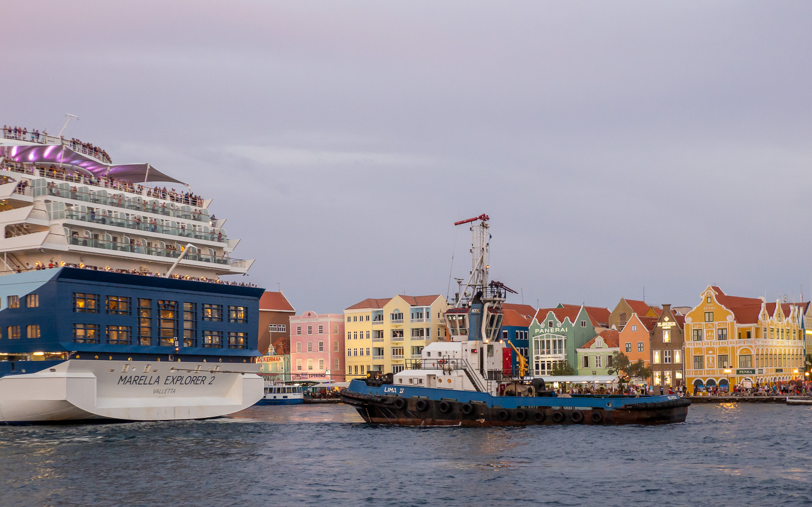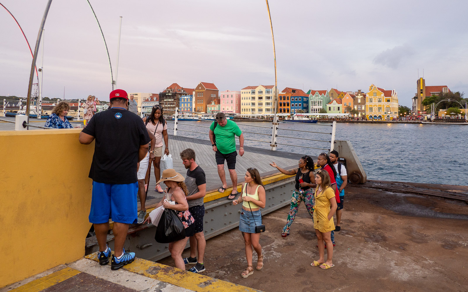 Viimeisenä iltana palasimme vielä kerran Sint Annabaain kanavan rannalle. Tällä kertaa osuimme paikalle juuri kuin TUI:n risteilijä Marella Explorer 2 teki lähtöä kanavasta ja onnistuimme näkemään miten Queen Emma -silta kääntyi kanavan rannan suuntaiseksi ja teki tilaa hinaajan ja risteilijän lähdölle. Silta saattaa aueta päivän mittaan useamman kerran, joko osittain, pienten laivojen takia, tai kokonaan, lyhyemmäksi tai pitemmäksi aikaa. Pitempi aika voi olla jopa kolme varttia, mutta tarvittaessa voi käyttää kanavan ylittämiseen ilmaista lauttaa.