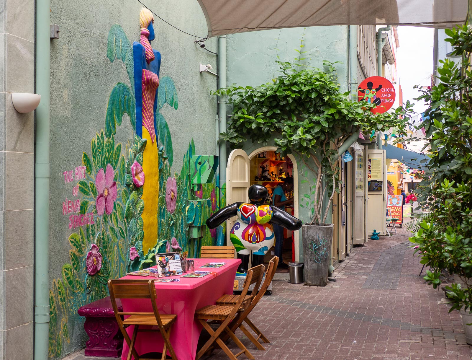 Willemstadissa on myös monessa paikassa reheviä värikkäitä naishahmoja. Ne ovat taiteilija Serena Israelin käsialaa ja niihin voi tutustua Chichi Shopissa Pundan kujilla tai tehtaalla saaren itäosassa. Ensimmäisen näimme jo hotellimme, Renaissance-hotellin, edustalla.