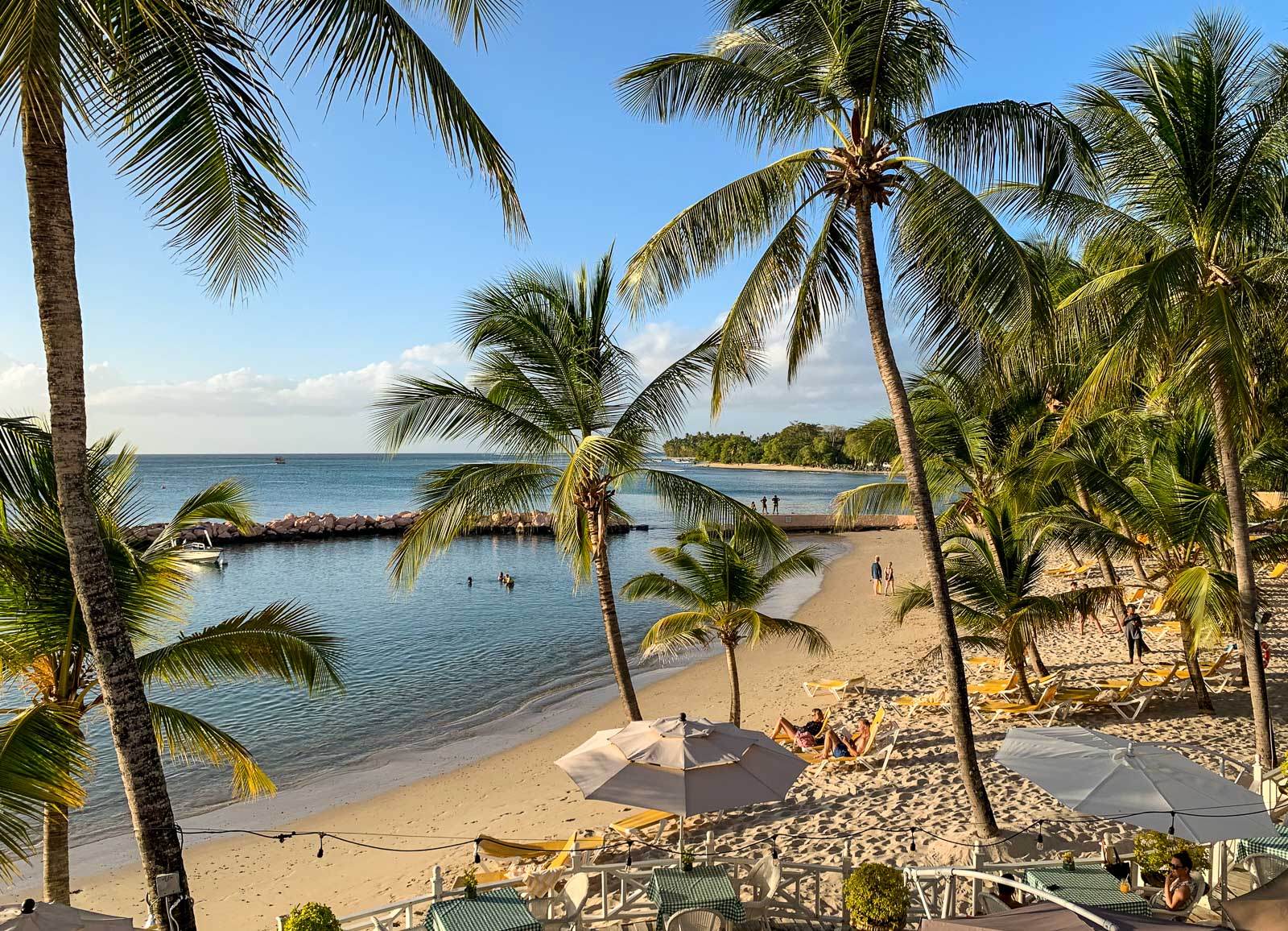 Tobagon Crown Pointissa sijaitseva Coco Reef olisi voinut riittää viikonlopun kohteeksi. Resortin keskipisteenä oli kahdelta suunnalta aallonmurtajan rajaama laguuni, jonka suojassa merivesikin lämpeni miellyttäväksi vaikka pitempäänkin kellumiseen. Merivesi oli sen verran suolaista, että oikea uiminen oli hankalaa, mutta mitä sitä nyt lomalla kuntoilemaan. Tai olisihan sitä voinut, resortin kuntosalilla (jätimme väliin). Aallonmurtajille kerääntyi etenkin iltaisin ja aamuisin lintuja tarkkailtavaksi vaikka auringonnousun tai -laskun värittäessä merellisen maiseman.
