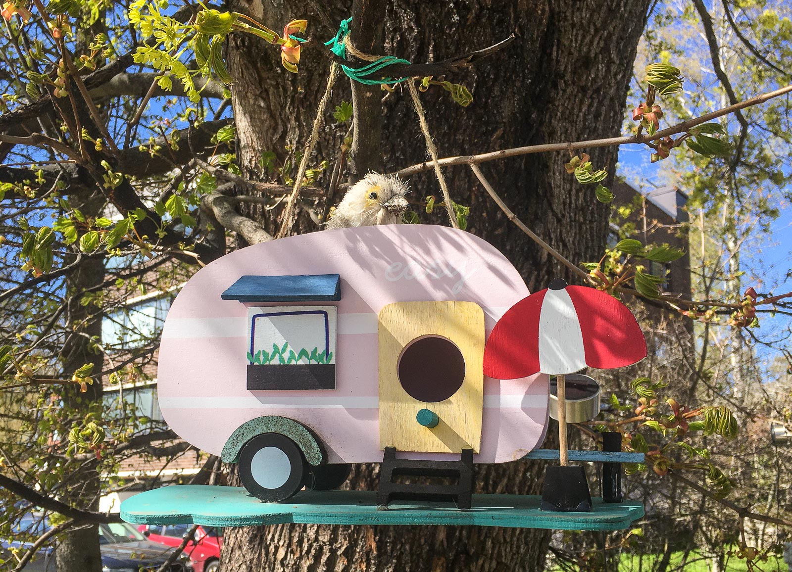 Lähirantoja kierrellessäni olen viime päivinä tehnyt myös muita kivoja löytöjä kuin kirsikkapuut. Hetken mietin Lidlin mainoksissa jokin aika sitten olleiden hassujen linnunpönttöjen hankintaa, mutta jäin epäilemään, että ottaisivatko linnut moisia omakseen ja tosikkona jätin hankkimatta. Silti ilahduin nähdessäni moisen yhden naapuritalon pihapuuhun ripustettuna! Mellstenin rannalla pieni purkki muovijätettä muistuttaa kauniisti roskaamattomuudesta, kuten myös lasten piirrokset muuallakin Haukilahdessa.