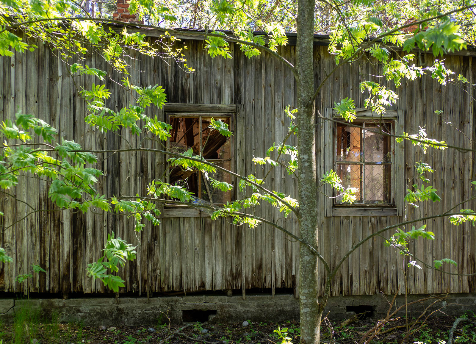 Metsään käännyttäessä polku kulkee vanhojen pääosin romahtaneiden rakennusten ohi. Näistä ensimmäiset ovat ajalta, jolloin osa Hankoniemestä vesialueineen oli vuokrattu venäläisille (1940-41). Jatkosodan aikana (1943-44) saksalaiset käyttivät aluetta sotilaiden ja tarvikkeiden kuljettamiseen pohjoiseen. Vuodesta 1948 alkaen niitä käytettiin naisten työsiirtolana aina 1960-luvulle asti. Mutta synkänkin historian raunioiden lomasta löytyy yllättäen vaikka tyylikäs istuinryhmä – jos vaikka aksel alkaisi painaa. Naisten työsiirtolasta on muuten hiukan juttua Evasion-blogissa.