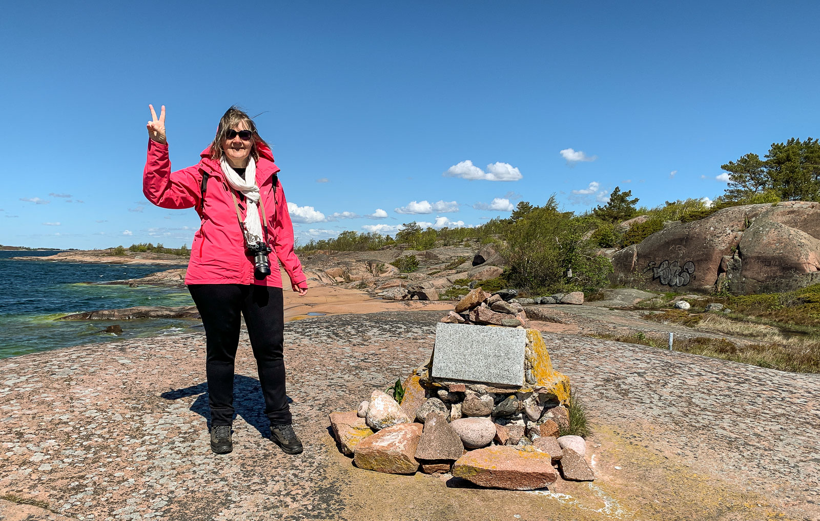 Lopulta polku sukeltaa metsästä rantakallioille Hangon satamaan vastapäätä ja polun haasteellisin osuus alkaa. Suomen eteläisin kärki on nimittäin vielä matkan päässä oikealla ja sinne kuljetaan kallioita ylös ja alas. Polku on kuitenkin täälläkin selkeästi merkitty ja melko tiheässäkin olevia pylväitä seuraten löytää kohdat, joissa haastavimpia hyppyjä on helpotettu asettamalla kivia portaiksi. Mutta lopulta kallio päättyy ja vastassa on pieni kivikasa, tässä se siis on. Luontopolun opastaulun mukaan ainakin. Itse kivikasassa olevan laatan tekstistä emme saaneet selvää paikan päällä emmekä myöhemmin valokuvistakaan vaikka niitä olisimme miten käsitelleet.